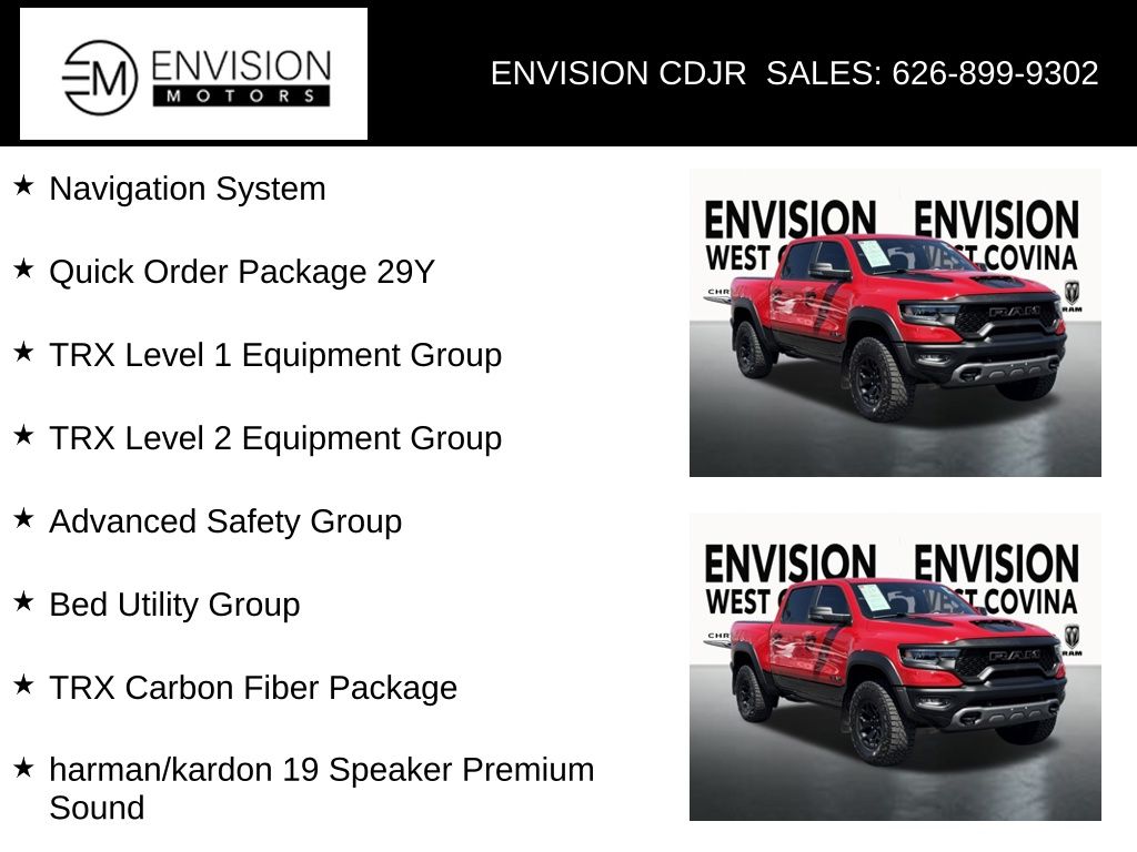 WE SPECIALIZE IN ALL CREDIT PROFILES! See what we can do for you! Call to find out (626) 899-9302.Recent Arrival!Odometer is 8037 miles below market average! #2 Seat Foam Cushion, 2-Door Passive Entry, Front Door Locks, 4 Way Front Headrests, Accent Color Door Handles, Adaptive Cruise Control w/Stop & Go, Advanced Safety Group, Bed Utility Group, Blind Spot & Cross Path Detection, Bucket Seats, Center Console Parts Module, Digital Rearview Mirror, Dome Dual LED Reading Lamp, Driver Seat Memory, Driver/Passenger Wrapped Assist Handles, Dual-Pane Panoramic Sunroof, Exterior Mirrors w/Memory, Front Door Accent Lighting, Front Seat Back Map Pockets, Full Length Premium Upgraded Floor Console, harman/kardon 19 Speaker Premium Sound, Heads-Up Display, Heated Front Seats, Heated Second Row Seats, Heated Steering Wheel, IP LED Ambient Light Pipe, Lane Keep Assist, Leather Trimmed Bucket Seats, Leather/Carbon Flat-Bottom Steering Wheel, Leather/Suede Flat-Bottom Steering Wheel, LED CHMSL Lamp, Luxury Front Door Trim Panel, MOPAR 4 Adjustable Cargo Tie-Down Hooks, MOPAR Bright Pedal Kit, MOPAR Deployable Bed Step, MOPAR Spray In Bedliner, Navigation System, ParkSense Front/Rear Park Assist w/Stop, Pedestrian Emergency Braking, Pick-Up Box Lighting, Power 4-Way Driver Lumbar Adjust, Power 4-Way Passenger Lumbar Adjust, Power 8-Way Driver & Passenger Seats, Power Adjustable Pedals, Power Adjustable Pedals w/Memory, Premium Wrapped IP Bezel, Quick Order Package 29Y, Radio/Driver Seat/Mirrors/Pedals Memory, Rain Sensitive Windshield Wipers, Real Carbon Fiber Interior Accents, Rear 60/40 Folding Seat, Rear 60/40 Folding Split Recline Seat, Rear Door Accent Lighting, Rear Underseat Compartment Storage, Rear Window Defroster, Remote Tailgate Release, Sun Visors w/Illuminated Vanity Mirrors, Surround View Camera System, Tailgate Ajar Warning Lamp, Trailer Brake Control, TRX Carbon Fiber Package, TRX Level 1 Equipment Group, TRX Level 2 Equipment Group, Universal Garage Door Opener, Ventilated Front Seats, Ventilated Rear Seats, Wheels: 18" x 9" Black Paint/Polish Aluminum, Wireless Charging Pad.Flame Red Clearcoat2023 Ram 1500 TRX 4WD 8-Speed Automatic 6.2L Supercharged HEMI V8 SRT**********All Pricing and Advertised Prices for any/all vehicles offered for sale does not include dealer installed accessories which can be purchased for an additional cost.********** The Factory Rebates may not be available on this vehicle if you elect to take advantage of a Special Alternative APR or Special Lease program. Some Factory Rebates are California Resident specific and may vary for residents of other states. NO sales to Dealers, Brokers or Exporters. For out of state purchase, customers must be present to purchase. If shipping is required, dealership must facilitate; no exceptions. Please contact us for special Multi-Vehicle or Fleet pricing. Prices are plus government fees and taxes, any finance charges, $85 documentary fee, $29 electronic registration fee, any emission testing charge and $1.75 per new tire state tire fee. *** We make every effort to provide accurate information, but please verify before purchasing. Leasing & financing available on approved credit. Trade-ins accepted. Subject to prior sale.