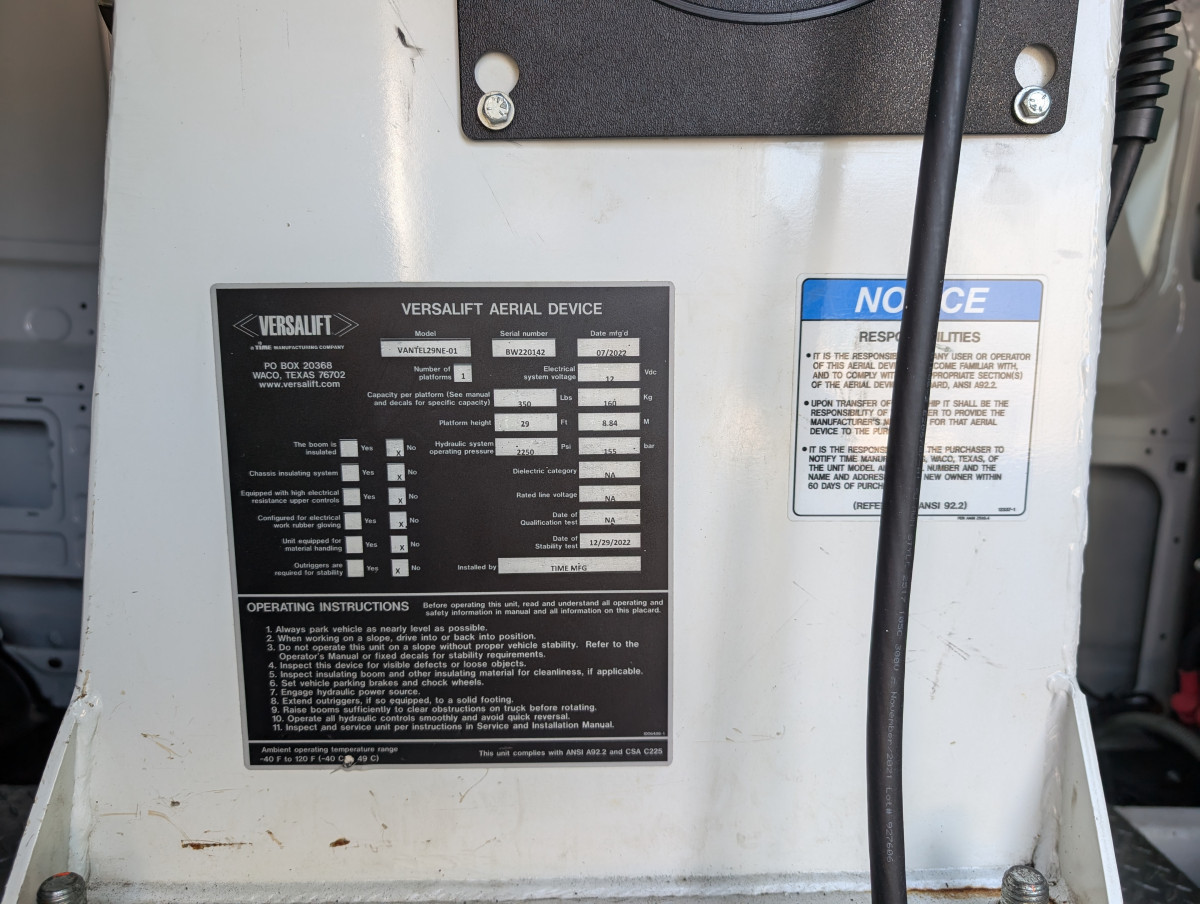 Here at FAM Vans we have over 350 vans and trucks in stock at any given time, plus we get fresh inventory every month. We can modify any vehicle to fit your needs or find the right one that fits your budget! Full Parts and Service departments. -LWB / 148-in WB -GVWR: 9,500 LBS -Includes backup camera -Sliding passenger door (curb-side) -Versalift Aerial Device (boom)