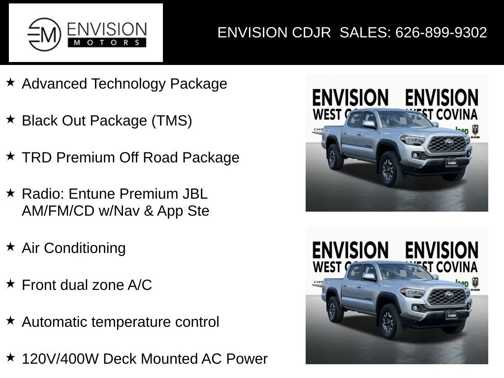 WE SPECIALIZE IN ALL CREDIT PROFILES! See what we can do for you! Call to find out (626) 899-9302.Odometer is 19459 miles below market average! 4WD, 120V/400W Deck Mounted AC Power, ABS brakes, Active Cruise Control, Advanced Technology Package, Air Conditioning, Alloy wheels, Auto-Dimming Rearview Mirror w/HomeLink, Automatic Headlights, Automatic temperature control, Black Chrome Exhaust Tip (TMS), Black Out Package (TMS), Black Overfenders, Blackout Emblem Overlays (TMS), Blind Spot Monitor w/Rear Cross Traffic Alert, Electronic Stability Control, Engine Immobilizer, Front dual zone A/C, Heated door mirrors, Heated Front Seats, Illuminated entry, Leather Seat Trim, LED Daytime Running Lights & Fog Lights, Low tire pressure warning, Mesh Front Grille, Multi Terrain Monitor, Power Sliding Rear Window w/Privacy Glass, Power Tilt/Slide Moonroof, Radio: Entune Premium JBL AM/FM/CD w/Nav & App Ste, Rear Parking Assist Sonar, Remote keyless entry, Smart Key w/Push Button Start, Tailgate Emblem (TMS), Traction control, TRD Premium Off Road Package.Celestial Silver2022 Toyota Tacoma TRD Off-Road 4WD 6-Speed Automatic 3.5L V6 PDI DOHC 24V LEV3-ULEV70 278hp**********All Pricing and Advertised Prices for any/all vehicles offered for sale does not include dealer installed accessories which can be purchased for an additional cost.********** The Factory Rebates may not be available on this vehicle if you elect to take advantage of a Special Alternative APR or Special Lease program. Some Factory Rebates are California Resident specific and may vary for residents of other states. NO sales to Dealers, Brokers or Exporters. For out of state purchase, customers must be present to purchase. If shipping is required, dealership must facilitate; no exceptions. Please contact us for special Multi-Vehicle or Fleet pricing. Prices are plus government fees and taxes, any finance charges, $85 documentary fee, $29 electronic registration fee, any emission testing charge and $1.75 per new tire state tire fee. *** We make every effort to provide accurate information, but please verify before purchasing. Leasing & financing available on approved credit. Trade-ins accepted. Subject to prior sale.