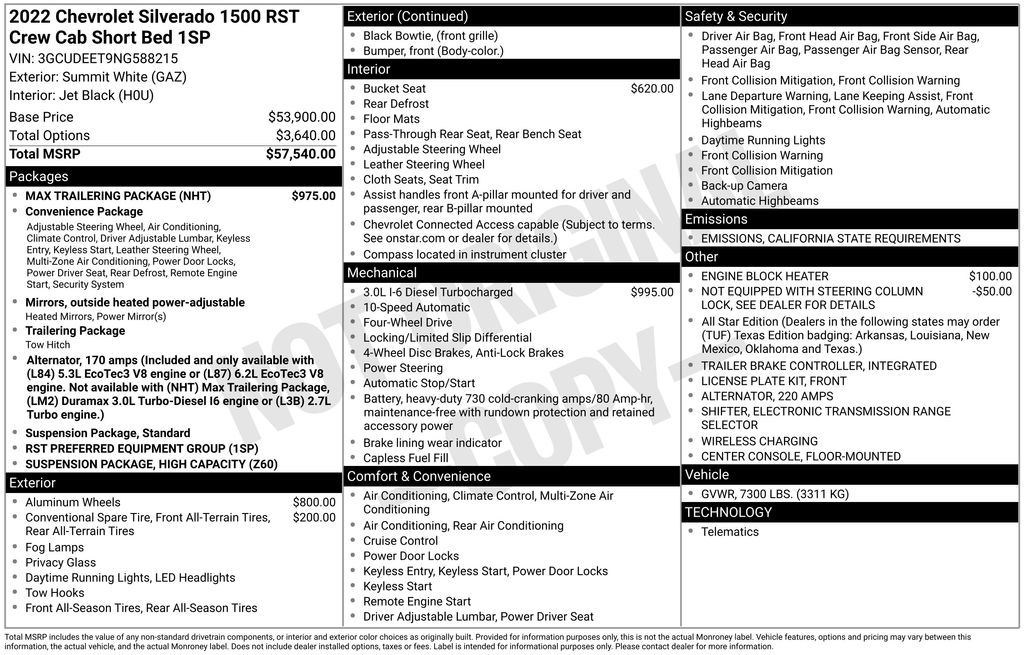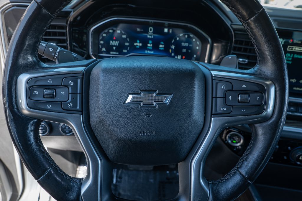 Summit White 2022 Chevrolet Silverado 1500 RST 4WD 10-Speed Automatic 3.0L I6 10-Speed Automatic, 4WD, Black Cloth, 10-Way Power Driver Seat w/Lumbar, 12.3" Multicolor Reconfigurable Digital Display, 120-Volt Bed Mounted Power Outlet, 120-Volt Instrument Panel Power Outlet, 6-Speaker Audio System, All-Star Edition, Auto-Locking Rear Differential, Bluetooth® For Phone, Chevrolet Connected Access Capable, Color-Keyed Carpeting Floor Covering, Compass, Convenience Package, Deep-Tinted Glass, Dual Rear USB Ports (Charge Only), Dual-Zone Automatic Climate Control, Electric Rear-Window Defogger, Electrical Steering Column Lock, Electronic Cruise Control, Enhanced Cooling Radiator, EZ Lift Power Lock & Release Tailgate, Front Frame-Mounted Black Recovery Hooks, Front LED Fog Lamps, Front Rubberized Vinyl Floor Mats, HD Rear Vision Camera, Heated Driver & Front Outboard Passenger Seats, Heated Power-Adjustable Outside Mirrors, Heated Steering Wheel, Heavier Duty Rear Springs, High Capacity Suspension Package, High Gloss Black Mirror Caps, Hitch Guidance, Increased RGAWR, Inside Rear-View Mirror w/Tilt, Integrated Trailer Brake Controller, Keyless Open & Start, Leather Wrapped Steering Wheel, LED Cargo Area Lighting, Manual Tilt/Telescoping Steering Column, Max Trailering Package, OnStar & Chevrolet Connected Services Capable, Power Front Windows w/Driver Express Up/Down, Power Front Windows w/Passenger Express Down, Power Rear Windows w/Express Down, Preferred Equipment Group 1SP, Rear 60/40 Folding Bench Seat (Folds Up), Rear Rubberized-Vinyl Floor Mats, Remote Vehicle Starter System, SiriusXM w/360L, Standard Suspension Package, Standard Tailgate, Steering Wheel Audio Controls, Theft Deterrent System (Unauthorized Entry), Trailering Package, Wheels: 20" x 9" Painted Aluminum, Wi-Fi Hot Spot Capable, Wireless Phone Projection.22/26 City/Highway MPG