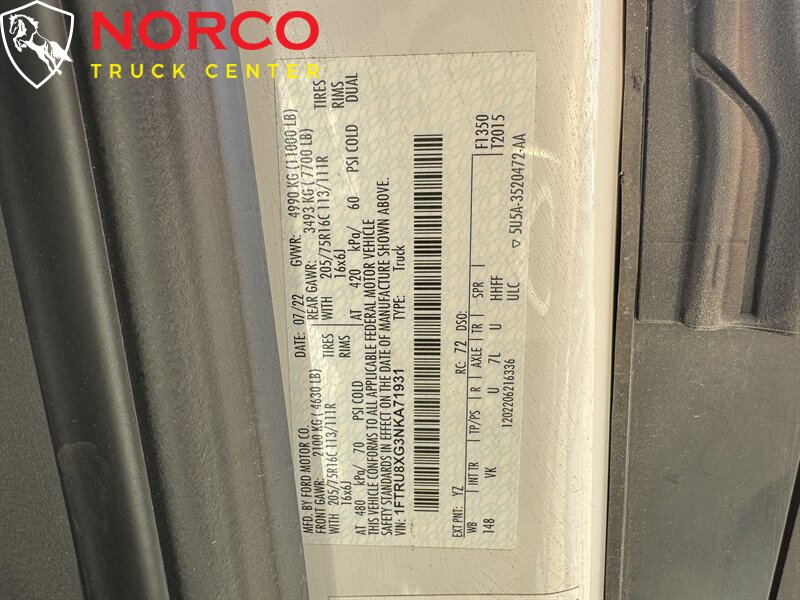 INSTALLED FEATURES: Front air conditioning, Front air conditioning zones: single, Airbag deactivation: passenger switch, Front airbags: dual, Side airbags: front, Side curtain airbags: front, Antenna type: mast, Auxiliary audio input: Bluetooth / USB, Radio: AM/FM, Total speakers: 4, ABS: 4-wheel, Braking assist, Cornering brake control, Electronic brakeforce distribution, Emergency braking preparation, Front brake type: ventilated disc, Power brakes, Rear brake type: ventilated disc, Armrests: dual front, Floor material: rubber/vinyl, Shift knob trim: urethane, Steering wheel trim: urethane, Assist handle: front / rear, Capless fuel filler system, Cargo area light, Center console: front console with storage, Cupholders: front, Multi-function remote: keyless entry / panic alarm / trunk release, One-touch windows: 1, Power outlet(s): 12V front / USB front, Power steering: variable/speed-proportional, Reading lights: front, Steering wheel: tilt and telescopic, Steering wheel mounted controls: audio / multi-function / phone, Storage: door pockets, Sun visors, Body side moldings: black, Door handle color: black, Front bumper color: black, Grille color: black / black surround, Mirror color: black, Rear bumper color: black, Rear trunk/liftgate: barn, Side door type: passenger-side manual sliding, Window trim: black, Infotainment screen size: 4 in., Clock, Digital odometer, External temperature display, Fuel economy display: range, Gauge: tachometer, Trip odometer, Warnings and reminders: coolant temperature warning / low fuel level / low oil pressure, Headlights: auto delay off / auto high beam dimmer / auto on/off / halogen, Roof-mounted lights, Side mirror adjustments: manual folding / power, Alternator: 250 amps, Auto start/stop, Auxiliary transmission fluid cooler, Battery: AGM / maintenance-free, Battery rating: 610 CCA, OEM roof height: high, Automatic emergency braking: front / front pedestrian, Automatic hazard warning lights, Camera system: rearview, Driver attention alert system, Impact sensor: door unlock / post-collision safety system, Lane deviation sensors, Pre-collision warning system: audible warning / pedestrian detection / visual warning, Rearview monitor: in dash, Front seatbelts: 3-point, Seatbelt warning sensor: front, Driver seat manual adjustments: 2 / reclining, Front headrests: 2 / adjustable, Front seat type: bucket, Passenger seat manual adjustments: 2 / reclining, Upholstery: vinyl, Anti-theft system: vehicle immobilizer, Power door locks: auto-locking, Crosswind stabilization, Hill holder control, Roll stability control, Stability control, Traction control, Trailer stability control, Front shock type: gas, Front spring type: coil, Front stabilizer bar, Front struts: MacPherson, Front suspension classification: independent, Front suspension type: lower control arms, Rear shock type: gas, Rear spring type: leaf, Rear suspension classification: solid live axle, Rear suspension type: multi-leaf, Hands-free phone call integration, Smart device app compatibility: FordPass Connect, Smart device app function: engine start / lock operation / maintenance status / vehicle location, Wi-Fi: hotspot, Wireless data link: Bluetooth, Dual rear wheels, Spare tire mount location: underbody, Spare tire size: full-size, Spare wheel type: steel, Tire Pressure Monitoring System, Wheels: steel, Front wipers: rain sensing / variable intermittent, Power windows: safety reverse, Solar-tinted glass