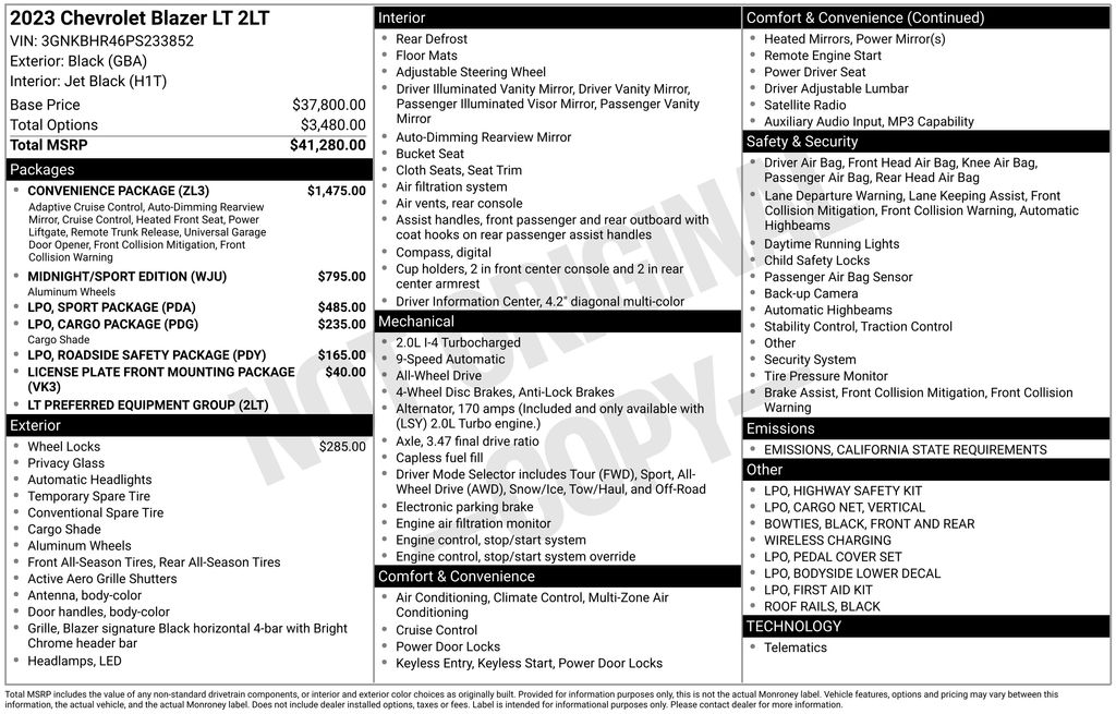 Black 2023 Chevrolet Blazer LT AWD 9-Speed Automatic with Overdrive 2.0L Turbocharged AWD, 8-Way Power Driver Seat Adjuster, Adaptive Cruise Control, Apple CarPlay/Android Auto, Automatic temperature control, Black Roof-Mounted Side Rails, Bodyside Lower Decal (LPO), Cargo Package (LPO), Convenience Package, Enhanced Automatic Emergency Braking, First Aid Kit (LPO), Front & Rear Black Bowties, Front dual zone A/C, Heated Driver & Front Passenger Seats, Highway Safety Kit, Inside Rear-View Auto-Dimming Mirror, Midnight/Sport Edition, Pedal Cover Set, Power driver seat, Preferred Equipment Group 2LT, Rear Power Programmable Liftgate, Retractable Cargo Shade, Roadside Safety Package (LPO), Sport Package, Universal Home Remote, Vertical Cargo Net (LPO), Wheels: 18" Grazen Metallic Aluminum, Wheels: 18" High Gloss Black Painted Aluminum, Wireless Charging.Odometer is 14885 miles below market average! 22/27 City/Highway MPG