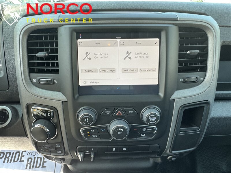 INSTALLED FEATURES: Air filtration, Front air conditioning, Front air conditioning zones: single, Airbag deactivation: passenger switch, Front airbags: dual, Side airbags: front, Side curtain airbags: front, Antenna type: mast, Auxiliary audio input: Bluetooth / iPod/iPhone / jack / USB, Radio: AM/FM / touch screen display / voice operated, Radio data system, Speed sensitive volume control, Total speakers: 6, ABS: 4-wheel, Brake drying, Braking assist, Electronic brakeforce distribution, Front brake type: ventilated disc, Power brakes, Rear brake type: ventilated disc, Armrests: front center, Dash trim: simulated alloy, Floor material: rubber/vinyl, Steering wheel trim: urethane, Assist handle: front, Cruise control, Cupholders: front, Overhead console: front, Power outlet(s): 12V front / USB front, Power steering, Reading lights: front, Rearview mirror: manual day/night, Steering wheel: tilt, Steering wheel mounted controls: cruise control / multi-function / phone / voice control, Storage: door pockets / organizer, Sun visors, Active grille shutters, Door handle color: black, Front bumper color: black, Grille color: black / black surround, Mirror color: black, Pickup bed light, Rear bumper color: black, Tailgate: removable, Window trim: black, Infotainment: Uconnect, Infotainment screen size: 5 in., Clock, Compass, Digital odometer, External temperature display, Fuel economy display: MPG / range, Gauge: tachometer, Instrument cluster screen size: 3.5 in., Multi-function display, Powertrain hour meter, Trip odometer, Warnings and reminders: low fuel level / low oil level / maintenance due, Headlights: auto delay off / auto on/off / halogen / quad headlights, Side mirror adjustments: manual / manual folding, 4WD selector: electronic hi-lo, 4WD type: part time, Alternator: 160 amps, Auxiliary oil cooler, Auxiliary transmission fluid cooler, Battery: maintenance-free, Battery rating: 730 CCA, Battery saver, Emissions: 50 state, Camera system: rearview, Child seat anchors: LATCH system, Crumple zones: front, Rearview monitor: in dash, Emergency locking retractors: front, Front seatbelts: 3-point, Seatbelt force limiters: front, Seatbelt pretensioners: front, Seatbelt warning sensor: front, Driver seat manual adjustments: 4 / reclining, Front headrests: 2 / adjustable, Front seat type: 40-20-40 split bench, Passenger seat manual adjustments: 4 / reclining, Upholstery: vinyl, Anti-theft system: vehicle immobilizer, Hill holder control, Roll stability control, Stability control, Traction control, Trailer stability control, Front shock type: twin-tube gas, Front spring type: coil, Front stabilizer bar, Front struts, Front suspension classification: independent, Front suspension type: short and long arm, Rear shock type: twin-tube gas, Rear spring type: coil, Rear stabilizer bar, Rear suspension classification: solid live axle, Rear suspension type: multi-link, Electronic messaging assistance: voice operated / with read function, Hands-free phone call integration: voice operated, Wireless data link: Bluetooth, Trailer hitch: Class III, Trailer wiring: 4-pin / 7-pin, Spare tire mount location: underbody, Spare tire size: full-size, Spare wheel type: steel, Tire Pressure Monitoring System, Wheels: steel, Front wipers: variable intermittent, Rear privacy glass, Solar-tinted glass