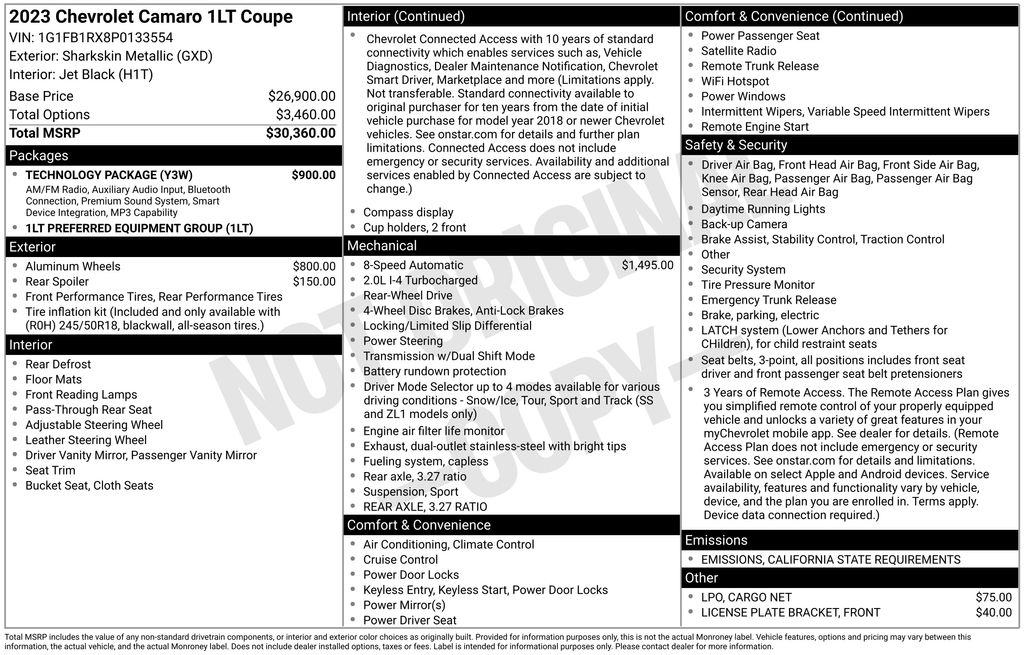 Sharkskin Metallic 2023 Chevrolet Camaro 1LT RWD 8-Speed Automatic 2.0L Turbocharged 18" Silver-Painted Aluminum Wheels, 6-Speaker Audio System Feature, Automatic temperature control, Bluetooth® For Phone, Bose Premium 9-Speaker Audio System Feature, Front Bucket Seats, Preferred Equipment Group 1LT, Radio: Chevrolet Infotainment 3 Plus System, SiriusXM w/360L, Technology Package, Variably intermittent wipers.Odometer is 2838 miles below market average! 22/30 City/Highway MPG