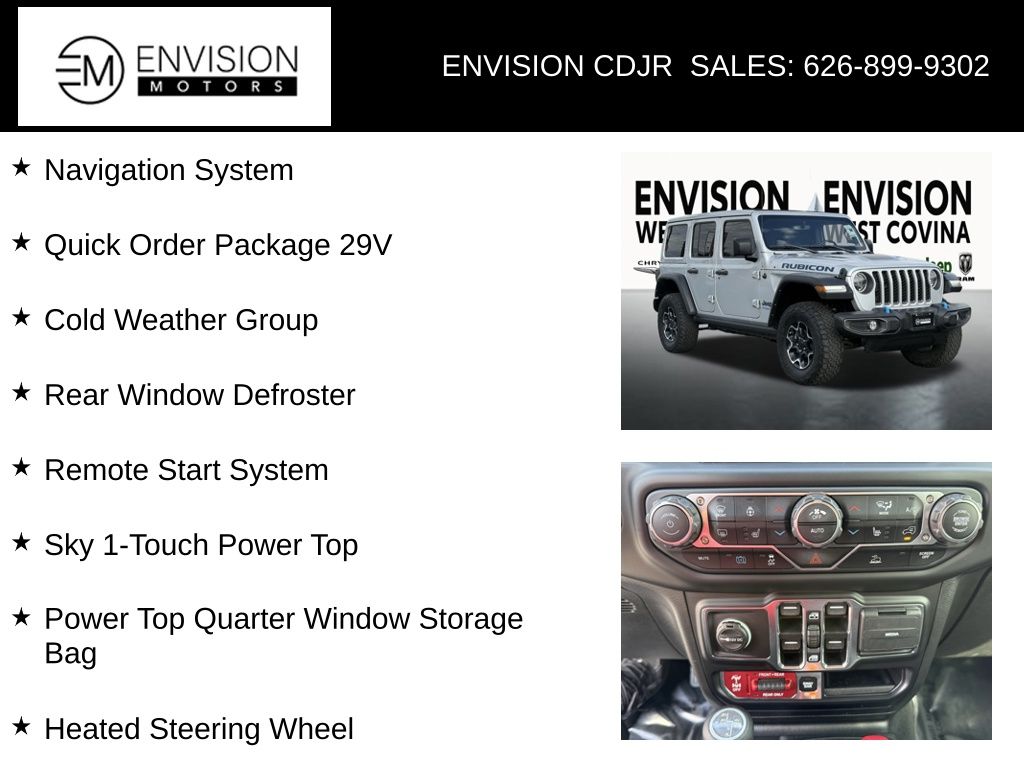 WE SPECIALIZE IN ALL CREDIT PROFILES! See what we can do for you! Call to find out (626) 899-9302.Certified. CARFAX One-Owner.2.0L I4 DOHC, Cold Weather Group, Heated Front Seats, Heated Steering Wheel, Navigation System, Power Top Quarter Window Storage Bag, Quick Order Package 29V, Rear Window Defroster, Rear Window Wiper/Washer, Remote Start System, Removable Rear Quarter Windows, Sky 1-Touch Power Top.Silver Zynith Clearcoat2022 Jeep Wrangler Unlimited Rubicon 4xe 4WD 8-Speed Automatic 2.0L I4 DOHCFCA US LLC Certified Pre-Owned Details: * Transferable Warranty * Warranty Deductible: $100 * Roadside Assistance * Vehicles Up to 75,000 Miles and/or 5 Model Years. 24-Hour Towing & Roadside Assistance, Car Rental Allowance, CARFAX® Vehicle History ReportTM and an Introductory 3-month Subscription to SiriusXM® Satellite Radio & Certified Warranty Upgrades * 125 Point Inspection * Powertrain Limited Warranty: 84 Month/100,000 Mile (whichever comes first) from original in-service date * Vehicle History * Limited Warranty: 3 Month/3,000 Mile (whichever comes first) after new car warranty expires or from certified purchase date**********All Pricing and Advertised Prices for any/all vehicles offered for sale does not include dealer installed accessories which can be purchased for an additional cost.********** The Factory Rebates may not be available on this vehicle if you elect to take advantage of a Special Alternative APR or Special Lease program. Some Factory Rebates are California Resident specific and may vary for residents of other states. NO sales to Dealers, Brokers or Exporters. For out of state purchase, customers must be present to purchase. If shipping is required, dealership must facilitate; no exceptions. Please contact us for special Multi-Vehicle or Fleet pricing. Prices are plus government fees and taxes, any finance charges, $85 documentary fee, $29 electronic registration fee, any emission testing charge and $1.75 per new tire state tire fee. *** We make every effort to provide accurate information, but please verify before purchasing. Leasing & financing available on approved credit. Trade-ins accepted. Subject to prior sale.