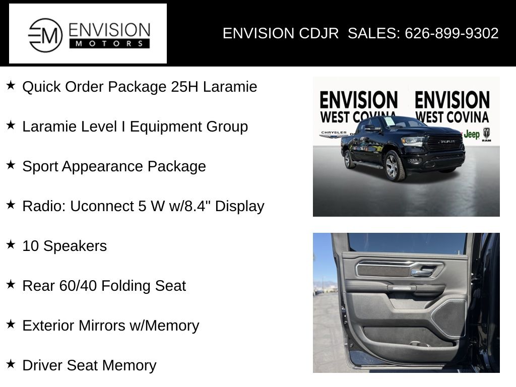WE SPECIALIZE IN ALL CREDIT PROFILES! See what we can do for you! Call to find out (626) 899-9302.Certified. CARFAX One-Owner. Clean CARFAX.#1 Seat Foam Cushion, 10 Speakers, 2nd Row In Floor Storage Bins, 3 Rear Seat Head Restraints, 4 Way Front Headrests, All Plant-Installed Decals, Auto High Beam Headlamp Control, Auto-Dimming Exterior Driver Mirror, Black Interior Accents, Blind Spot & Cross Path Detection, Body Color Door Handles, Body Color Exterior Mirrors, Body Color Front Bumper, Body Color Premium Power Mirrors, Body Color Rear Bumper w/Step Pads, Bucket Seats, Convex Wide-Angle Mirror Insert, Delete LED Lamp - Floor Console Bin, Driver Seat Memory, Exterior Mirrors Courtesy Lamps, Exterior Mirrors w/Heating Element, Exterior Mirrors w/Memory, Exterior Mirrors w/Supplemental Signals, Foam Bottle Insert (Door Trim Panel), Front Seat Back Map Pockets, Full Length Upgraded Floor Console, Grille Surround 3 Body Color Tex 2 Black, Heated Front Seats, Heated Steering Wheel, Laramie Level I Equipment Group, Leather Trimmed Bucket Seats, ParkSense Front/Rear Park Assist w/Stop, Power 2-Way Driver Lumbar Adjust, Power 2-Way Passenger Lumbar Adjust, Power 8-Way Driver & Passenger Seats, Power-Folding Mirrors, Quick Order Package 25H Laramie, Radio: Uconnect 5 W w/8.4" Display, Rain Sensitive Windshield Wipers, Rear 60/40 Folding Seat, Remote Tailgate Release, Sport Appearance Package, Sport Decal, Sport Performance Hood, Twill Film Appliques, Ventilated Front Seats, Wheels: 20" x 9" Premium Painted w/Inserts.Diamond Black Crystal Pearlcoat2022 Ram 1500 Laramie 4WD 8-Speed Automatic HEMI 5.7L V8 Multi Displacement VVTFCA US LLC Certified Pre-Owned Details: * Vehicle History * Transferable Warranty * 125 Point Inspection * Roadside Assistance * Limited Warranty: 3 Month/3,000 Mile (whichever comes first) after new car warranty expires or from certified purchase date * Warranty Deductible: $100 * Vehicles Up to 75,000 Miles and/or 5 Model Years. 24-Hour Towing & Roadside Assistance, Car Rental Allowance, CARFAX® Vehicle History ReportTM and an Introductory 3-month Subscription to SiriusXM® Satellite Radio & Certified Warranty Upgrades * Powertrain Limited Warranty: 84 Month/100,000 Mile (whichever comes first) from original in-service date**********All Pricing and Advertised Prices for any/all vehicles offered for sale does not include dealer installed accessories which can be purchased for an additional cost.********** The Factory Rebates may not be available on this vehicle if you elect to take advantage of a Special Alternative APR or Special Lease program. Some Factory Rebates are California Resident specific and may vary for residents of other states. NO sales to Dealers, Brokers or Exporters. For out of state purchase, customers must be present to purchase. If shipping is required, dealership must facilitate; no exceptions. Please contact us for special Multi-Vehicle or Fleet pricing. Prices are plus government fees and taxes, any finance charges, $85 documentary fee, $29 electronic registration fee, any emission testing charge and $1.75 per new tire state tire fee. *** We make every effort to provide accurate information, but please verify before purchasing. Leasing & financing available on approved credit. Trade-ins accepted. Subject to prior sale.