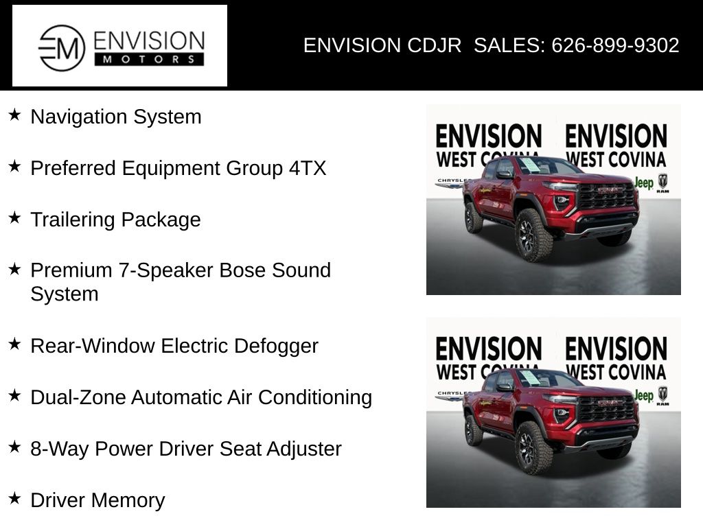 WE SPECIALIZE IN ALL CREDIT PROFILES! See what we can do for you! Call to find out (626) 899-9302.CARFAX One-Owner. Clean CARFAX.Odometer is 13450 miles below market average! 4WD, 120-Volt Bed Mounted Power Outlet, 2 Rear USB Ports in Center Console (Charge-Only), 220 Amps Alternator, 6-Way Power Passenger Seat Adjuster, 8-Way Power Driver Seat Adjuster, Adaptive Cruise Control, Automatic Emergency Braking, Blind Zone Steering Assist, Canyon Pro Safety, Driver & Front Passenger Illuminated Visors, Driver & Front Passenger Ventilated Seats, Driver Memory, Driver Seatback Map Pocket, Driver-Selectable Full-Locking Front Differential, Driver-Selectable Full-Locking Rear Differential, Dual-Zone Automatic Air Conditioning, EZ-Lift & Lower Tailgate, Following Distance Indicator, Forward Collision Alert, Front LED Fog Lamps, Front Pedestrian & Bicyclist Braking, HD Surround Vision, Heated Driver & Front Passenger Seats, Heated Power-Adjustable Outside Mirrors, Heated Steering Wheel, Inside Rear-View Auto-Dimming Mirror, Integrated Trailer Brake Controller, IntelliBeam Automatic High Beam On/Off, Interior Overhead Courtesy Light w/Dual Reading Lamp, Lane Keep Assist w/Lane Departure Warning, Manual Rear-Sliding Window, Multicolor 6.3" Diagonal Head-Up Display, MultiStow Tailgate, Navigation System, Power Driver Lumbar Control Seat Adjuster, Power Passenger Lumbar Control Seat Adjuster, Preferred Equipment Group 4TX, Premium 7-Speaker Bose Sound System, Rear Center Fold-Down Armrest w/2 Cupholders, Rear Cross Traffic Braking, Rear of Console 120-Volt Power Outlet, Rear Pedestrian Alert, Rear-Window Electric Defogger, Remote Vehicle Starter System, Safety Alert Seat, Spray-On Bedliner, Tailgate Keyed Cylinder Lock, Tilt & Telescopic Manual Steering Column, Trailering App System, Trailering Package, Ultrasonic Rear Park Assist, Wheels: 17" x 8" Black High Gloss Machined Finish, Wireless Charging.Volcanic Red Tintcoat2023 GMC Canyon AT4X 4WD 8-Speed Automatic 2.7L Turbo**********All Pricing and Advertised Prices for any/all vehicles offered for sale does not include dealer installed accessories which can be purchased for an additional cost.********** The Factory Rebates may not be available on this vehicle if you elect to take advantage of a Special Alternative APR or Special Lease program. Some Factory Rebates are California Resident specific and may vary for residents of other states. NO sales to Dealers, Brokers or Exporters. For out of state purchase, customers must be present to purchase. If shipping is required, dealership must facilitate; no exceptions. Please contact us for special Multi-Vehicle or Fleet pricing. Prices are plus government fees and taxes, any finance charges, $85 documentary fee, $29 electronic registration fee, any emission testing charge and $1.75 per new tire state tire fee. *** We make every effort to provide accurate information, but please verify before purchasing. Leasing & financing available on approved credit. Trade-ins accepted. Subject to prior sale.