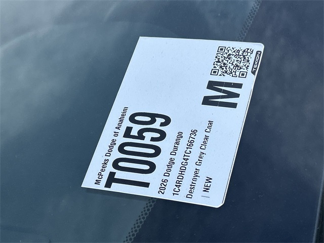 Destroyer Gray Clearcoat 2026 Dodge Durango GT RWD 8-Speed Automatic 3.6L V6 24V VVT INTERIOR & EXTERIOR PROFESSIONALLY DETAILED FOR DELIVERY, MCPEEK CHRYSLER DODGE JEEP RAM FAMILY OWNED AND OPERATED SINCE 1961 !!!!!.All prices are subject to change without notice. All vehicles subject to prior sale. Advertised price does not include Dealer Installed Accessories or Commercial Bed/Body Upfits. Please contact dealer to receive the most up to date pricing information and complete details.Receive Free lube and oil filter changes for up to 45,000 miles for 3 years!!! McPeek's Dodge of Anahiem 1221 S. Auto Center Drive Anahiem, CA 92806 714-262-4902. Price includes: $1000 - 2026 West BC Regional Bonus Cash . Exp. 01/20/2026 $1000 - 2026 National Engine Retail Bonus Cash . Exp. 02/02/2026 $1000 - 2026 West BC Regional Retail Bonus Cash . Exp. 01/20/2026