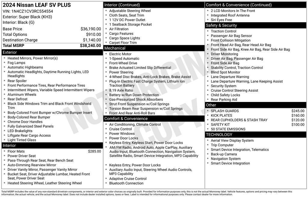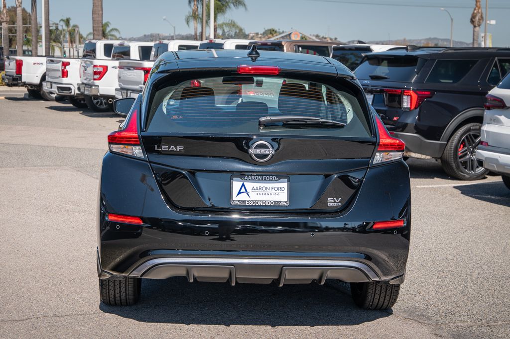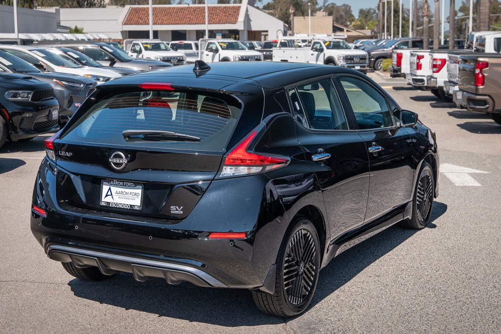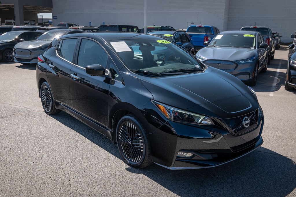 Super Black 2024 Nissan Leaf SV Plus FWD Single Speed Reducer Electric Motor Alloy wheels, Delay-off headlights, Heated Front Bucket Seats, Heated front seats, Navigation system: NissanConnect EV w/Navigation and Services, Panic alarm, Security system, Wheels: 17" Machined Finish Aluminum Alloy.Odometer is 9272 miles below market average! 121/98 City/Highway MPG