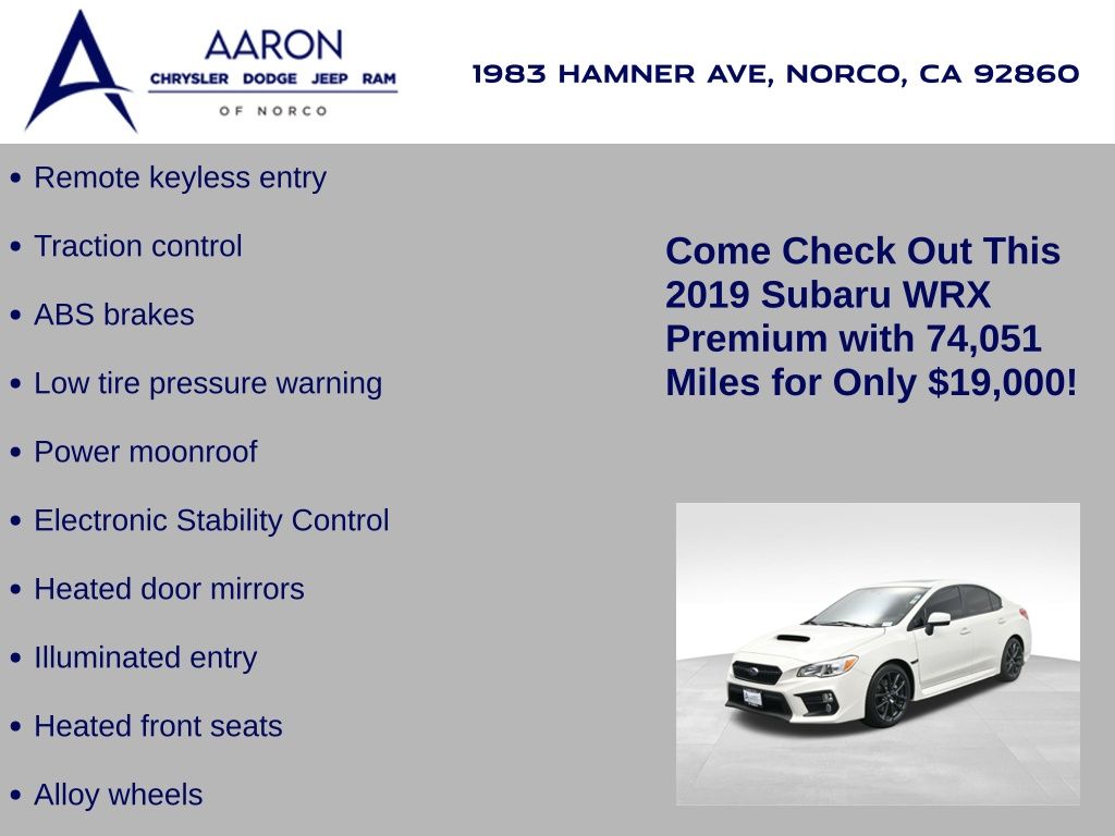 2019 Subaru WRX Premium AWD. Short throw shifter, 2.0L turbo engine, 6-speed manual, 1-Owner, no accidents, just over 74,000 miles.2019 Subaru WRX Premium AWD with STI short throw shifter package, 2.0L turbocharged engine, manual transmission, and stylish Carbon Black interior. Includes performance features, Crystal White Pearl finish, and a suite of driver-focused technology. Para la version en espanol, vea abajo.This WRX Premium offers seating for five, Symmetrical All-Wheel Drive, a power moonroof, Subaru STARLINK infotainment with 7-inch touchscreen, and advanced safety like blind-spot monitoring and rear cross-traffic alert. Perfect for drivers who want a blend of performance, control, and everyday practicality.Renowned for its reliability and thrilling performance in the sport compact sedan segment.We pride ourselves on offering thoroughly inspected vehicles with easy financing and transparent market-based pricing. Our dedicated team ensures a no-pressure environment, expert guidance, and a smooth purchase experience. Your satisfaction and confidence are our top priorities every step of the way.Take the next step by messaging us for a personalized quote or to arrange a convenient visit. We offer flexible options like virtual consultations and promise to resolve any questions transparently to build your confidence in us.2019 Subaru WRX Premium AWD. Palanca de cambios corta, motor 2.0L turbo, transmision manual de 6 velocidades, 1-Dueno, sin accidentes, poco mas de 74,000 millas.2019 Subaru WRX Premium AWD con paquete STI short throw shifter, motor 2.0L turboalimentado, transmision manual e interior Carbon Black. Incluye detalles de rendimiento, acabado Crystal White Pearl y un conjunto de tecnologia enfocada en el conductor.Este WRX Premium ofrece espacio para cinco pasajeros, Symmetrical All-Wheel Drive, quemacocos electrico, sistema Subaru STARLINK con pantalla tactil de 7 pulgadas y seguridad avanzada como monitoreo de punto ciego y alerta de trafico cruzado trasero. Ideal para quienes buscan rendimiento, control y practicidad diaria.Reconocido por su confiabilidad y emocionante desempeno en el segmento de sedanes deportivos compactos.Nos enorgullece ofrecer vehiculos minuciosamente inspeccionados con financiamiento accesible y precios transparentes basados en el mercado. Nuestro equipo brinda un ambiente sin presion, asesoria experta y una experiencia de compra fluida. Tu satisfaccion y confianza son siempre nuestra prioridad.Listo para dar el siguiente paso? Envianos un mensaje para una cotizacion personalizada o para agendar una visita conveniente. Ofrecemos opciones flexibles como consultas virtuales y respondemos todas tus dudas con transparencia para darte plena confianza.