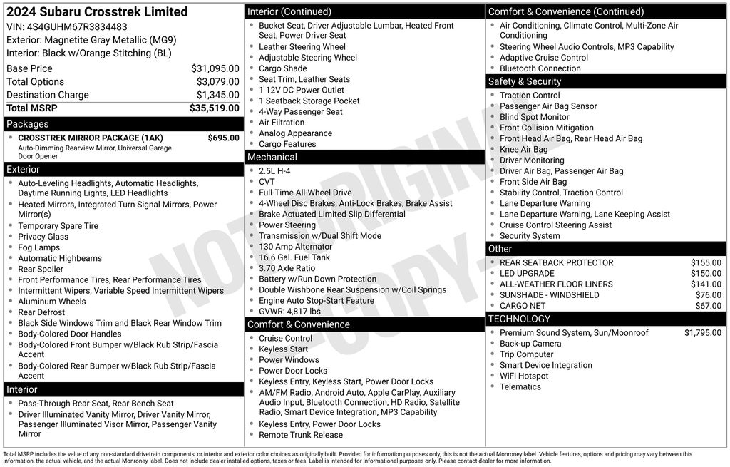 Magnetite Gray Metallic 2024 Subaru Crosstrek Limited AWD Lineartronic CVT 2.5L 4-Cylinder DOHC 16V Auto-Dimming Exterior Mirror w/Approach Light, Auto-Dimming Mirror w/Compass & HomeLink, Crosstrek Mirror Package, harman/kardon Audio & Power Moonroof, harman/kardon Surround Sound Speaker System, Leather-Trimmed Upholstery, Power Moonroof, Rear Seatback Protector.Odometer is 3054 miles below market average! 26/33 City/Highway MPG