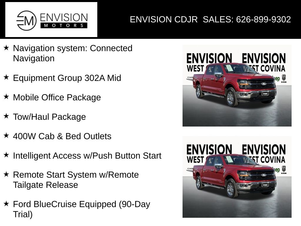 WE SPECIALIZE IN ALL CREDIT PROFILES! See what we can do for you! Call to find out (626) 899-9302.CARFAX One-Owner. Clean CARFAX.Odometer is 7675 miles below market average! 3.5L PowerBoost Full-Hybrid V6, 4WD, 400W Cab & Bed Outlets, Adaptive Cruise Control w/Stop & Go, Auto-Dimming Rear-View Mirror, Cloth 40/Console/40 Front Seats, Console Worksurface, Equipment Group 302A Mid, Ford BlueCruise Equipped (90-Day Trial), Heated Front Seats, Integrated Trailer Brake Controller, Intelligent Access w/Push Button Start, Mobile Office Package, Navigation system: Connected Navigation, Partitioned Lockable Rear Storage, Power Glass Heated Sideview Mirrors, Power-Sliding Rear Window, Remote Start System w/Remote Tailgate Release, Speed Sign Recognition, Tow/Haul Package.Rapid Red Metallic Tinted Clearcoat2024 Ford F-150 XLT 4WD 10-Speed Automatic 3.5L PowerBoost Full-Hybrid V6**********All Pricing and Advertised Prices for any/all vehicles offered for sale does not include dealer installed accessories which can be purchased for an additional cost.********** The Factory Rebates may not be available on this vehicle if you elect to take advantage of a Special Alternative APR or Special Lease program. Some Factory Rebates are California Resident specific and may vary for residents of other states. NO sales to Dealers, Brokers or Exporters. For out of state purchase, customers must be present to purchase. If shipping is required, dealership must facilitate; no exceptions. Please contact us for special Multi-Vehicle or Fleet pricing. Prices are plus government fees and taxes, any finance charges, $85 documentary fee, $29 electronic registration fee, any emission testing charge and $1.75 per new tire state tire fee. *** We make every effort to provide accurate information, but please verify before purchasing. Leasing & financing available on approved credit. Trade-ins accepted. Subject to prior sale.