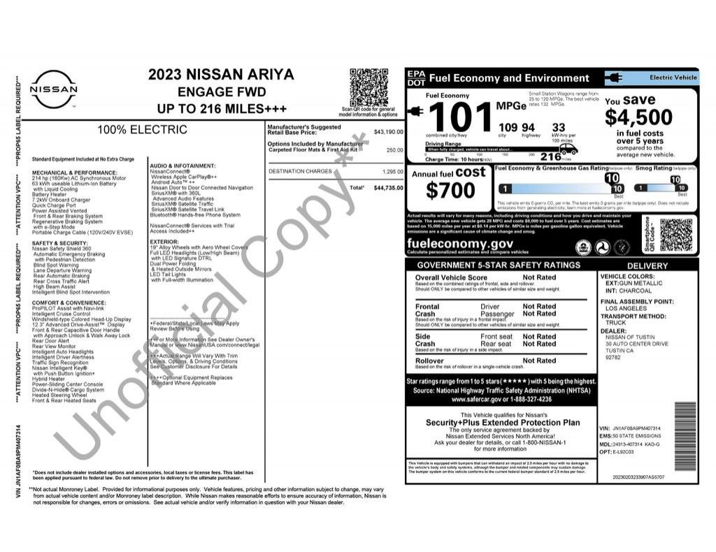 Discover the Captivating 2023 Nissan Ariya ENGAGE: A Fusion of Innovative Technology and Uncompromising StylePrepare to be captivated by the 2023 Nissan Ariya ENGAGE, a remarkable electric vehicle that seamlessly blends cutting-edge technology, exceptional performance, and refined sophistication. This stunning Ariya model is poised to redefine your driving experience, offering a level of comfort, convenience, and environmental responsibility that is truly unparalleled.• Navigation system: Nissan Door to Door Connected NavigationImmerse yourself in the Ariya's advanced features, designed to elevate your driving experience to new heights. The state-of-the-art navigation system, Nissan Door to Door Connected Navigation, provides seamless guidance, ensuring you reach your destination with ease and confidence.Slip behind the wheel and feel the power of the Ariya's electric motor, delivering an exhilarating performance with a remarkable EPA-estimated 109 MPGe in the city and 94 MPGe on the highway. The Ariya's impressive efficiency not only reduces your carbon footprint but also saves you money at the pump, allowing you to enjoy the journey without worrying about fuel costs.Comfort and convenience are paramount in the Ariya, as evidenced by the heated front and rear seats, the dual-zone automatic climate control, and the premium Bose audio system. The Ariya's spacious and well-appointed interior, complete with leatherette seating surfaces, creates an environment that is both luxurious and inviting.Safety is of the utmost importance, and the Ariya delivers with a comprehensive suite of advanced safety features. From the Nissan Intelligent Mobility technology to the emergency communication system, you can rest assured that you and your loved ones are well-protected on the road.Elevate your driving experience with the 2023 Nissan Ariya ENGAGE. This remarkable electric vehicle seamlessly blends cutting-edge technology, exceptional performance, and uncompromising style, making it the perfect choice for those who demand the very best. Visit our showroom today to explore the Ariya and discover how it can transform your daily commute into a true pleasure.