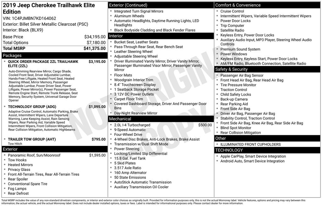Billet Silver Metallic Clearcoat 2019 Jeep Cherokee Trailhawk 4WD 9-Speed 948TE Automatic 2.0L I4 DOHC 7 & 4 Pin Wiring Harness, 8.4" Touchscreen Display, Adaptive Cruise Control w/Stop & Go, Advanced Brake Assist, Alloy wheels, Apple CarPlay, Apple CarPlay/Android Auto, Auto High Beam Headlamp Control, Auto-Dimming Rear-View Mirror, Auxiliary Transmission Oil Cooler, Class III Receiver Hitch, Exterior Mirrors Courtesy Lamps, Exterior Mirrors w/Memory, Exterior Mirrors w/Supplemental Signals, Front fog lights, Full Speed Forward Collision Warning Plus, Hands-Free Power Liftgate, Heated Front Seats, Heated Steering Wheel, Integrated Voice Command w/Bluetooth, Lane Departure Warning Plus, Parallel/Perpendicular Park/Unpark Assist w/Stop, Power Driver/Passenger 4-Way Lumbar Adjust, Power Front Driver/Passenger Seats, Power Front/Fixed Rear Full Sunroof, Premium Alpine Speaker System, Premium Leather Trimmed Bucket Seats, Quick Order Package 2ZL Trailhawk Elite, Radio/Driver Seat/Exterior Mirrors Memory, Rain Sensitive Windshield Wipers, Remote Start System, Security Alarm, Side Distance Warning, SiriusXM Satellite Radio, Technology Group, Tonneau Cover, Trailer Tow Group, Trailer Tow Wiring Harness, Universal Garage Door Opener, Ventilated Front Seats, Wheels: 17" x 7.5" Painted/Polished Aluminum, Windshield Wiper De-Icer.Recent Arrival! Odometer is 9688 miles below market average! 20/26 City/Highway MPG