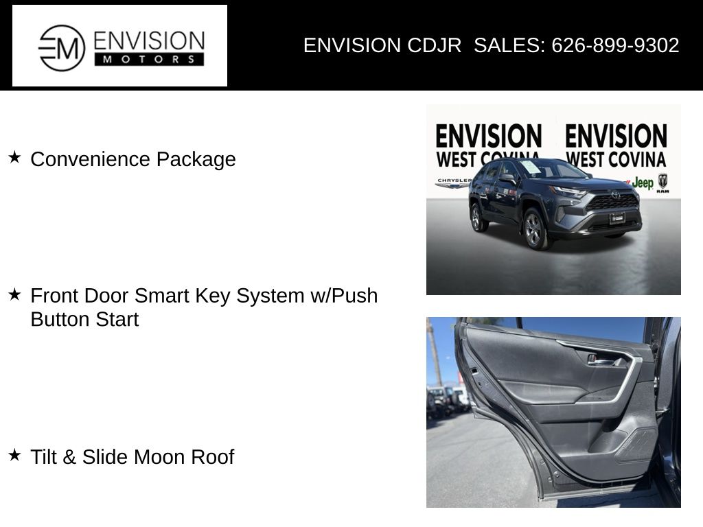 WE SPECIALIZE IN ALL CREDIT PROFILES! See what we can do for you! Call to find out (626) 899-9302.CARFAX One-Owner.Odometer is 18825 miles below market average! 27/34 City/Highway MPG Black Cloth, Convenience Package, Front Door Smart Key System w/Push Button Start, Tilt & Slide Moon Roof.Magnetic Gray2023 Toyota RAV4 XLE FWD 8-Speed Automatic 2.5L 4-Cylinder DOHC Dual VVT-i**********All Pricing and Advertised Prices for any/all vehicles offered for sale does not include dealer installed accessories which can be purchased for an additional cost.********** The Factory Rebates may not be available on this vehicle if you elect to take advantage of a Special Alternative APR or Special Lease program. Some Factory Rebates are California Resident specific and may vary for residents of other states. NO sales to Dealers, Brokers or Exporters. For out of state purchase, customers must be present to purchase. If shipping is required, dealership must facilitate; no exceptions. Please contact us for special Multi-Vehicle or Fleet pricing. Prices are plus government fees and taxes, any finance charges, $85 documentary fee, $29 electronic registration fee, any emission testing charge and $1.75 per new tire state tire fee. *** We make every effort to provide accurate information, but please verify before purchasing. Leasing & financing available on approved credit. Trade-ins accepted. Subject to prior sale.