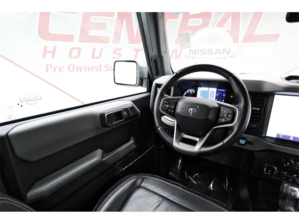 Central Houston Nissan is proud to present you with another True Market Priced Pre-Owned Vehicle. This 2022 Ford Bronco Badlands is loaded with the following Factory Options: Equipment Group 333A High Package (12" LCD Capacitive Touchscreen w/Swipe Capability, 2-Door Intelligent Access w/Lock/Unlock, 360-Degree Camera, Additional Sound Deadening, Ambient Footwell Lighting, Auto-Dimming Interior Rear-View Mirror, Connected Navigation, Dr & Pass Illuminated Sliding Visor Vanity Mirrors, Dual-Zone Electronic Automatic Temperature Control, Enhanced Voice Recognition, Front Parking Sensors, Front Row Heated Seats, Information on Demand Panel, Power Outlet - Back Side of Center Floor Console, Rear Parking Sensors, and Sideview Mirrors), 4-Wheel Disc Brakes, 4.7 Axle Ratio, 6 Speakers, ABS brakes, Air Conditioning, Alloy wheels, AM/FM radio: SiriusXM with 360L, AM/FM Stereo, Auto High-Beam Headlamps, Auto High-beam Headlights, BLIS Blind Spot Information System, Brake assist, Carbonized Gray Molded-In-Color Hard Top, Compass, Delay-off headlights, Driver door bin, Driver vanity mirror, Dual front impact airbags, Dual front side impact airbags, Electronic Stability Control, Emergency communication system: 911 Assist, Engine Block Heater, Exterior Parking Camera Rear, Ford Performance Heavy-Duty Modular Front Bumper, Front anti-roll bar, Front Bucket Seats, Front Center Armrest, Front reading lights, Front Row Top Panels Storage Bag, Front wheel independent suspension, Fully automatic headlights, Hard Top Sound Deadening Headliner, Heated door mirrors, Illuminated entry, Integrated roll-over protection, Lane-Keeping System, Leather Shift Knob, Low tire pressure warning, Marine Grade Vinyl Bucket Seats, Occupant sensing airbag, Outside temperature display, Overhead airbag, Overhead console, Panic alarm, Passenger door bin, Passenger vanity mirror, Power door mirrors, Power steering, Power windows, Pre-Collision Assist w/Automatic Emergency Braking, Radio data system, Rear-View Camera, Rear-Window Defroster & Washer, Remote keyless entry, Security system, SiriusXM Radio w/360L, Speed control, Split folding rear seat, Steering wheel mounted audio controls, SYNC 4, Tachometer, Telescoping steering wheel, Tilt steering wheel, Towing Capability, Traction control, Trip computer, Variably intermittent wipers, Voltmeter, Wheel Lock Kit (DIO), and Wheels: 17" Machined Carbonized Aluminum!!Awards: * NACTOY 2022 North American Utility of the YearCentral Houston Nissan is more than just your typical car dealership. When our customers visit us, our goal is to provide quality vehicles, exceptional service and a friendly atmosphere. Our staff has been trained to create ease during your purchase or service experience and we are always making sure you get everything you want and deserve out of your visit. Our vision and mission is an employee-centered and customer-focused environment. Vehicles may be subject to prep package and market adjustment. When you buy from Central Houston Nissan, we'll make it the best car buying experience you've ever had. When you purchase a New Nissan or a qualifying Pre-Owned vehicle from Central Houston Nissan, you are automatically enrolled into our Central Houston Nissan Central Care Program at no cost to you. You can’t beat that! Vehicles may be subject to prep package and market adjustment. Stop by 2901 S Loop W, Houston, Texas 77054 today!!!