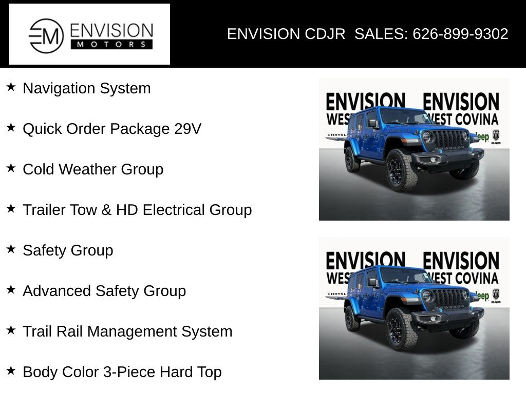 WE SPECIALIZE IN ALL CREDIT PROFILES! See what we can do for you! Call to find out (626) 899-9302.Certified.2.0L I4 DOHC, 7 & 4 Pin Wiring Harness, 700 Amp Maintenance Free Battery, Adaptive Cruise Control w/Stop, Advanced Brake Assist, Advanced Safety Group, Auto High Beam Headlamp Control, Auxiliary Switches, Blind Spot & Cross Path Detection, Body Color 3-Piece Hard Top, Body Color Fender Flares, Cargo Compartment Floor Mat, Class II Receiver Hitch, Cold Weather Group, Freedom Panel Storage Bag, Full Speed Forward Collision Warning Plus, Heated Front Seats, Heated Steering Wheel, Navigation System, ParkSense Rear Park Assist System, Quick Order Package 29V, Radio: Uconnect 4C Nav w/8.4" Display, Rear Window Defroster, Rear Window Wiper/Washer, Remote Start System, Safety Group, Trail Rail Management System, Trailer Tow & HD Electrical Group, Wheels: 17" x 7.5" Machined/Painted Black.Hydro Blue Pearl Coat2021 Jeep Wrangler Unlimited Rubicon 4xe 4WD 8-Speed Automatic 2.0L I4 DOHCFCA US LLC Certified Pre-Owned Details: * Vehicle History * Transferable Warranty * Limited Warranty: 3 Month/3,000 Mile (whichever comes first) after new car warranty expires or from certified purchase date * Warranty Deductible: $100 * Vehicles Up to 75,000 Miles and/or 5 Model Years. 24-Hour Towing & Roadside Assistance, Car Rental Allowance, CARFAX® Vehicle History ReportTM and an Introductory 3-month Subscription to SiriusXM® Satellite Radio & Certified Warranty Upgrades * Powertrain Limited Warranty: 84 Month/100,000 Mile (whichever comes first) from original in-service date * 125 Point Inspection * Roadside Assistance**********All Pricing and Advertised Prices for any/all vehicles offered for sale does not include dealer installed accessories which can be purchased for an additional cost.********** The Factory Rebates may not be available on this vehicle if you elect to take advantage of a Special Alternative APR or Special Lease program. Some Factory Rebates are California Resident specific and may vary for residents of other states. NO sales to Dealers, Brokers or Exporters. For out of state purchase, customers must be present to purchase. If shipping is required, dealership must facilitate; no exceptions. Please contact us for special Multi-Vehicle or Fleet pricing. Prices are plus government fees and taxes, any finance charges, $85 documentary fee, $29 electronic registration fee, any emission testing charge and $1.75 per new tire state tire fee. *** We make every effort to provide accurate information, but please verify before purchasing. Leasing & financing available on approved credit. Trade-ins accepted. Subject to prior sale.