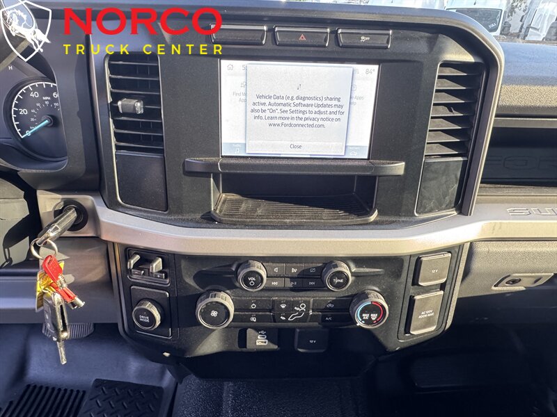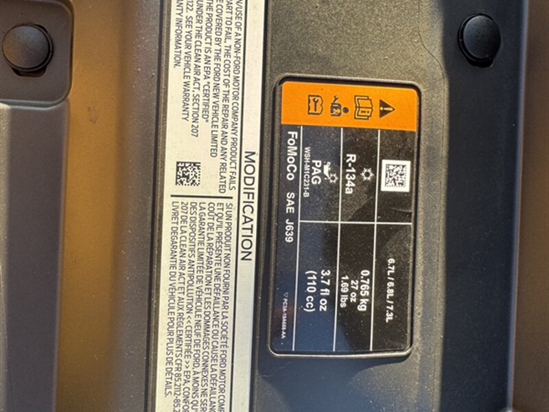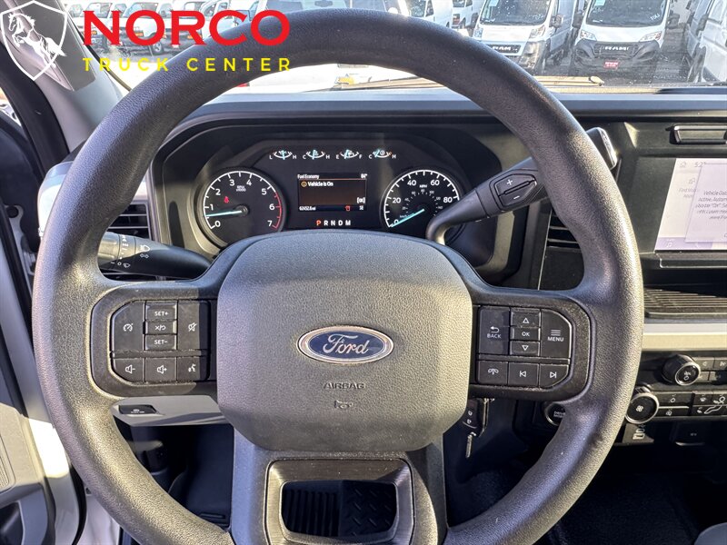 INSTALLED FEATURES: Air filtration, Front air conditioning, Front air conditioning zones: single, Airbag deactivation: passenger switch, Front airbags: dual, Side airbags: front, Side curtain airbags: front / rear, Antenna type: mast, Auxiliary audio input: Bluetooth / iPod/iPhone / USB, Radio: AM/FM / touch screen display / voice operated, Speed sensitive volume control, Total speakers: 4, ABS: 4-wheel, Braking assist, Electronic brakeforce distribution, Front brake type: ventilated disc, Power brakes, Rear brake type: ventilated disc, Armrests: front center, Door sill trim: scuff plate, Floor material: rubber/vinyl, Steering wheel trim: urethane, Assist handle: front, Cruise control, Cupholders: front, Multi-function remote: keyless entry / panic alarm, One-touch windows: 2, Overhead console: front, Power outlet(s): 12V front / USB front / USB-C front, Power steering, Power windows: lockout button, Reading lights: front / rear, Rearview mirror: manual day/night, Steering wheel: tilt and telescopic, Steering wheel mounted controls: audio / cruise control / multi-function / phone / voice control, Storage: accessory hook / door pockets, Vanity mirrors: passenger, Door handle color: black, Front bumper color: black, Grille color: black, Mirror color: black, Pickup bed light, Rear bumper color: black, Side door type: dual rear-hinged access, Tailgate: lift assist / power locking / removable, Window trim: black, Connected in-car apps: app marketplace integration / Google POIs / Google search, Infotainment: SYNC, Infotainment screen size: 8 in., Smartphone integration: wireless Android Auto / wireless Apple CarPlay, Clock, Digital odometer, External temperature display, Fuel economy display: MPG / range, Gauge: oil pressure / tachometer / transmission temperature, Instrument cluster screen size: 4.2 in., Multi-function display, Powertrain hour meter, Trip odometer, Warnings and reminders: low fuel level / maintenance due, Clearance lights, Daytime running lights, Headlights: auto delay off / auto on/off / halogen / quad headlights / wiper activated, Side mirror adjustments: manual folding / manual telescoping / power, Side mirrors: heated / integrated turn signals, Towing mirrors, Alternator: 160 amps, Battery: maintenance-free, Battery rating: 750 CCA, Battery saver, Automatic hazard warning lights, Camera system: rearview, Child seat anchors: LATCH system, Crumple zones: front, Impact sensor: alert system / door unlock / post-collision safety system, Programmable safety key, Rearview monitor: in dash, Emergency locking retractors: front / rear, Front seatbelts: 3-point, Rear seatbelts: 3-point, Seatbelt pretensioners: front, Seatbelt warning sensor: front, Driver seat manual adjustments: 6 / lumbar / reclining, Front headrests: 2 / adjustable, Front seat type: 40-20-40 split bench, Passenger seat manual adjustments: 4 / reclining, Rear headrests: 3 / adjustable, Rear seat folding: folds up / split, Rear seat type: 60-40 split bench, Upholstery: vinyl, Anti-theft system: vehicle immobilizer, Power door locks, Hill holder control, Roll stability control, Stability control, Traction control, Trailer stability control, Front shock type: gas, Front spring type: coil, Front stabilizer bar, Front suspension classification: independent, Front suspension type: twin I-beam, Rear shock type: gas, Rear spring type: leaf, Rear suspension classification: solid live axle, Rear suspension type: multi-leaf, Electronic messaging assistance: voice operated / with read function, Hands-free phone call integration: voice operated, Smart device app compatibility: FordPass Connect, Smart device app function: engine start / lock operation / maintenance status / vehicle location, Wi-Fi: hotspot, Wireless data link: Bluetooth, Tow hooks: front, Trailer brake controller, Trailer hitch, Trailer wiring: 4-pin / 7-pin, Spare tire mount location: underbody, Spare tire size: full-size, Spare wheel type: steel, Tire Pressure Monitoring System, Wheels: painted steel, Front wipers: variable intermittent, Power windows: safety reverse, Solar-tinted glass: front