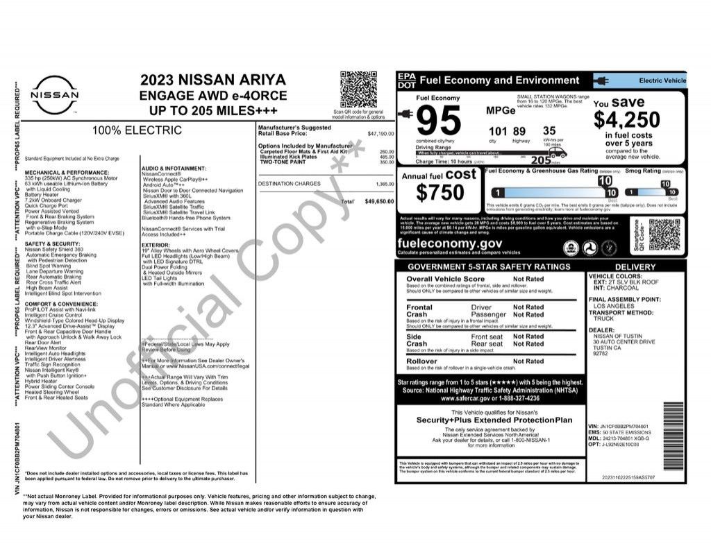 Discover the Captivating 2023 Nissan Ariya ENGAGE e-4ORCE - A Cutting-Edge Electric SUV That Redefines the Driving ExperienceStep into the future of electric mobility with the remarkable 2023 Nissan Ariya ENGAGE e-4ORCE. This cutting-edge SUV seamlessly blends advanced technology, exceptional performance, and uncompromising style, creating a driving experience that will leave you captivated.• Illuminated Kick Plates• Carpeted Floor Mats & First Aid Kit• Navigation system: Nissan Door to Door Connected Navigation• Special Paint - Brilliant Silver/Black Diamond• 19" Alloy WheelsPowered by an electric motor and boasting Nissan's innovative e-4ORCE all-wheel-drive system, the Ariya ENGAGE delivers a thrilling and responsive ride. With an impressive 101 MPGe in the city and 89 MPGe on the highway, this electric SUV offers exceptional efficiency and a range that will keep you exploring without limits.Climb inside and be welcomed by a meticulously crafted interior that combines premium materials and cutting-edge technology. The Heads-Up Display, Heated Front Bucket Seats, and Leatherette Seating Surfaces elevate your driving experience, while the Nissan Door to Door Connected Navigation system ensures you always reach your destination with ease.Safety is paramount in the Ariya ENGAGE, with an array of advanced features like Dual Front Impact Airbags, Electronic Stability Control, and Brake Assist keeping you and your loved ones protected on every journey. The Emergency Communication System and Low Tire Pressure Warning further enhance your peace of mind.Discover the perfect balance of style, performance, and technology in the 2023 Nissan Ariya ENGAGE e-4ORCE. This remarkable electric SUV is waiting to redefine your driving experience. Visit our showroom today and experience the future of electric mobility.