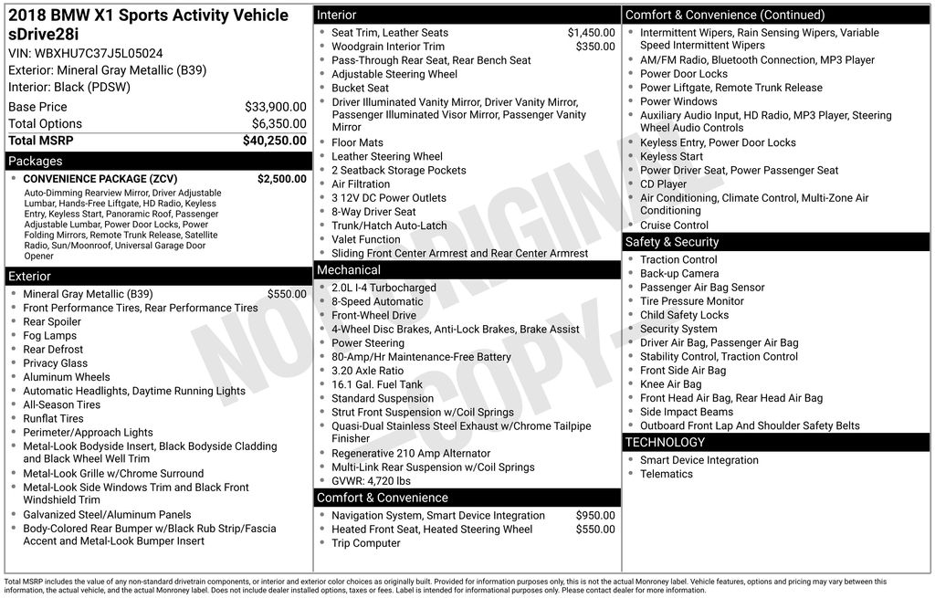 Mineral Grey Metallic 2018 BMW X1 sDrive28i FWD 8-Speed Automatic 2.0L 4-Cylinder DOHC 16V TwinPower TurboRecent Arrival! 23/32 City/Highway MPGAwards: * JD Power Automotive Performance, Execution and Layout (APEAL) Study, Initial Quality Study (IQS) * JD Power Initial Quality Study (IQS)