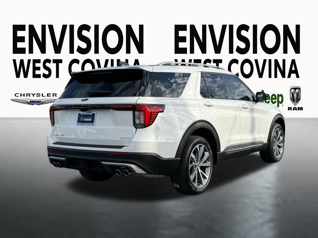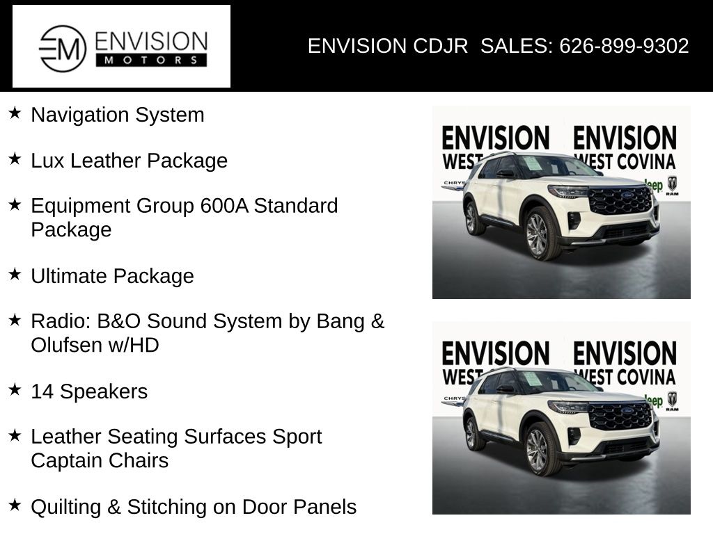 WE SPECIALIZE IN ALL CREDIT PROFILES! See what we can do for you! Call to find out (626) 899-9302.CARFAX One-Owner.Odometer is 3282 miles below market average! 4WD, 14 Speakers, Equipment Group 600A Standard Package, Leather Seating Surfaces Sport Captain Chairs, Lux Leather Package, Navigation System, Platinum Badges on Front Row Seats, Quilting & Stitching on Door Panels, Quilting & Stitching on Seats, Radio: B&O Sound System by Bang & Olufsen w/HD, Ultimate Package, Wheels: 21" Dark Alloy-Painted Machined Aluminum.White Metallic2025 Ford Explorer Platinum 4WD 10-Speed Automatic 3.0L EcoBoost V6**********All Pricing and Advertised Prices for any/all vehicles offered for sale does not include dealer installed accessories which can be purchased for an additional cost.********** The Factory Rebates may not be available on this vehicle if you elect to take advantage of a Special Alternative APR or Special Lease program. Some Factory Rebates are California Resident specific and may vary for residents of other states. NO sales to Dealers, Brokers or Exporters. For out of state purchase, customers must be present to purchase. If shipping is required, dealership must facilitate; no exceptions. Please contact us for special Multi-Vehicle or Fleet pricing. Prices are plus government fees and taxes, any finance charges, $85 documentary fee, $29 electronic registration fee, any emission testing charge and $1.75 per new tire state tire fee. *** We make every effort to provide accurate information, but please verify before purchasing. Leasing & financing available on approved credit. Trade-ins accepted. Subject to prior sale.