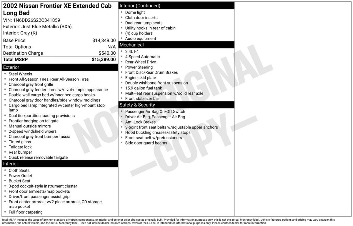 This 2002 Nissan Frontier XE is the kind of small pickup people look for and almost never find anymore. Clean Carfax history, no accidents reported, and only 63,468 miles as of October 2025. Thats less than 3,000 miles per year. Most trucks from this era have been worked hard or modified. This one lived an easy life right here in California and it shows.The Frontier XE delivers the simple, dependable design that made these trucks legendary. Its the Club Cab body style, giving you useful rear storage space and a practical bed without being oversized. Power comes from the proven 2.4L 4-cylinder engine with rear-wheel driveeasy to maintain, reliable, and efficient. Carfax confirms consistent mileage readings and no odometer issues.What makes this Frontier special is its story. It never left California. The report shows years of maintenance with local shops including Poway Precision Automotive and Midas in Poway, plus consistent emissions inspection passes from 2008 through 2024. Oil changes, brakes, tires, and alignments were all kept up, proving it was cared for, not just parked.At just over sixty-three thousand miles, this truck is a standout survivor. Most 2002 pickups have two or three times that mileage. Youre looking at a clean, lightly driven example that still feels tight and solid. Perfect as a dependable runaround, weekend project truck, or light-duty daily driver that wont cost new-truck money.The Carfax report confirms no structural damage, no airbag deployments, and no accident or damage history. Thats rare at this age and gives you the kind of confidence thats hard to find in a pre-2005 pickup.Driving this Frontier is refreshingly simple. It sits lower, has excellent visibility, and is easy to park anywhere. The compact size makes it ideal for first-time truck owners, homeowners who need a reliable hauler, or anyone wanting a basic, honest truck without the bulk of a full-size.This particular Frontier stayed right here in Poway and came through Aaron Ford of Poway, where it received a full inspection and service prior to sale. Carfax documents the most recent service here in October 2025. Youre not guessingyou can see the record, see the truck, and deal directly with a local Ford store you can trust.Small, clean, rear-wheel-drive pickups like this are disappearing fast. Most online listings are high-mileage, modified, or from out of state. This one remains stock, local, and low-milethe exact combination buyers chase but rarely find.Who is this truck perfect for? Someone who wants a dependable small pickup without the payment shock of a new one. Someone who values low mileage and local history. Someone who appreciates a truck thats easy to own, easy to park, and built to last.Dont wait too longclean California trucks like this do not stay available. Call or email to confirm availability and set a time to see it in person. Well have it pulled up and ready when you arrive.Family Owned ~ Community Driven ~ You Get More at Aaron Ford of Poway.All vehicles are subject to prior sale. Price does not include applicable government fees and taxes, finance charges, $30 electronic filing charge, $85 document fee, and emission testing charges.
