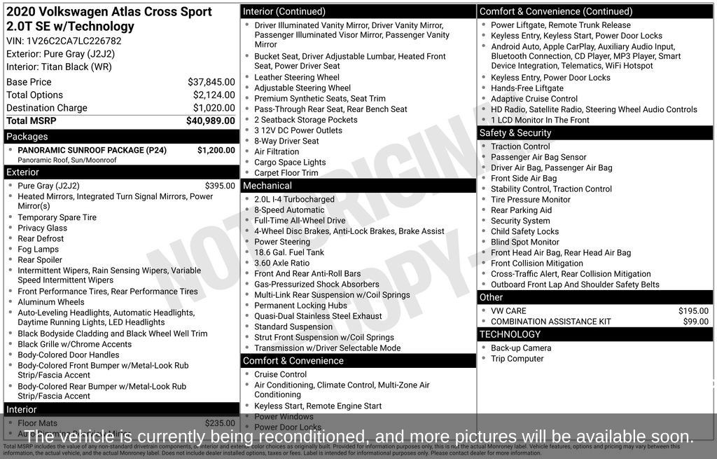 Gray 2020 Volkswagen Atlas Cross Sport 2.0T SE w/Technology 4Motion AWD 8-Speed Automatic with Tiptronic 2.0L TSI 6 Speakers, Alloy wheels, AM/FM radio: SiriusXM, Power driver seat, Radio: Composition Media w/8.0" Touchscreen, Wheels: 20" 5-Spoke Silver Alloy (CQ0).Odometer is 9159 miles below market average!