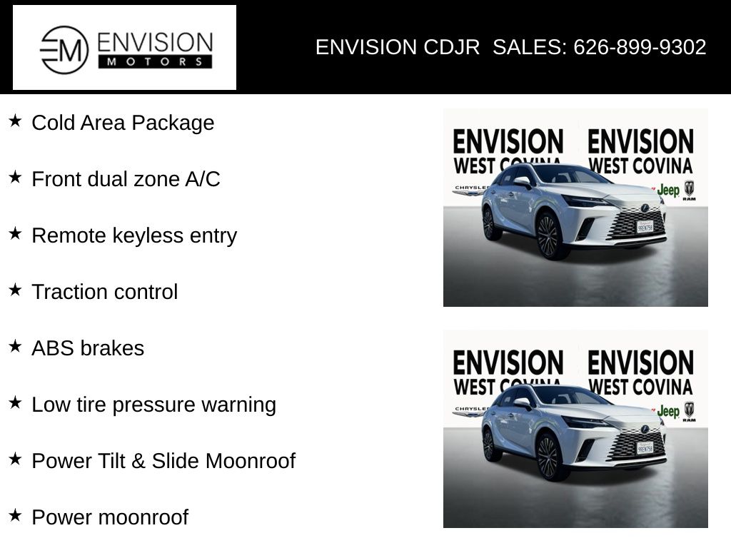 WE SPECIALIZE IN ALL CREDIT PROFILES! See what we can do for you! Call to find out (626) 899-9302.Clean CARFAX.22/29 City/Highway MPG Black W/Black Open Pore, ABS brakes, Active Cruise Control, Alloy wheels, Cold Area Package, Compass, Digital Rearview Mirror, Electronic Stability Control, Front dual zone A/C, Heated & Ventilated Front Bucket Seats, Heated door mirrors, Heated front seats, Illuminated entry, Leather Seat Trim, Low tire pressure warning, Power Liftgate, Power moonroof, Power Tilt & Slide Moonroof, Remote keyless entry, Traction control, Wheels: 21" 20-Spoke Alloy.Eminent White Pearl2023 Lexus RX 350 Premium Plus FWD 8-Speed Automatic 2.4L I4 PDI Turbocharged DOHC 16V LEV3-SULEV30 275hp**********All Pricing and Advertised Prices for any/all vehicles offered for sale does not include dealer installed accessories which can be purchased for an additional cost.********** The Factory Rebates may not be available on this vehicle if you elect to take advantage of a Special Alternative APR or Special Lease program. Some Factory Rebates are California Resident specific and may vary for residents of other states. NO sales to Dealers, Brokers or Exporters. For out of state purchase, customers must be present to purchase. If shipping is required, dealership must facilitate; no exceptions. Please contact us for special Multi-Vehicle or Fleet pricing. Prices are plus government fees and taxes, any finance charges, $85 documentary fee, $29 electronic registration fee, any emission testing charge and $1.75 per new tire state tire fee. *** We make every effort to provide accurate information, but please verify before purchasing. Leasing & financing available on approved credit. Trade-ins accepted. Subject to prior sale.