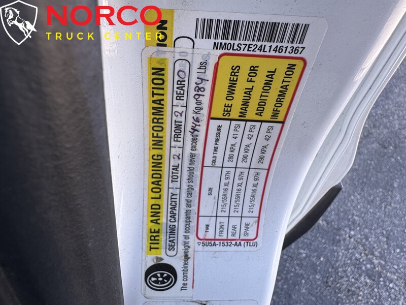 INSTALLED FEATURES: Air filtration, Front air conditioning, Front air conditioning zones: single, Airbag deactivation: occupant sensing passenger, Front airbags: dual, Side airbags: front, Side curtain airbags: front, Antenna type: mast, Auxiliary audio input: Bluetooth / jack / USB, Radio: AM/FM, Total speakers: 4, ABS: 4-wheel, Braking assist, Electronic brakeforce distribution, Emergency braking preparation, Front brake type: ventilated disc, Power brakes, Rear brake type: disc, Door trim: cloth, Floor material: rubber/vinyl, Shift knob trim: urethane, Steering wheel trim: urethane, Assist handle: front, Capless fuel filler system, Cargo area light, Center console: front console with armrest and storage, Cupholders: 2 / front, Multi-function remote: keyless entry / panic alarm / trunk release, One-touch windows: 1, Overhead console: front, Power outlet(s): 12V cargo area / 12V front, Power steering, Steering wheel: tilt and telescopic, Storage: cargo tie-down anchors and hooks / door pockets, Sun visors, Body side moldings: black, Door handle color: black, Front bumper color: black, Grille color: black / black surround, Headlight bezel color: black, Mirror color: black, Rear bumper color: black, Rear trunk/liftgate: barn, Side door type: dual manual sliding, Window trim: black, Infotainment screen size: 4.2 in., Clock, Digital odometer, External temperature display, Fuel economy display: MPG / range, Gauge: tachometer, Instrument cluster screen size: 4.2 in., Multi-function display, Trip odometer, Warnings and reminders: low fuel level / maintenance due, Daytime running lights, Headlights: auto on/off / halogen / wiper activated, Side mirror adjustments: manual / manual folding, Alternator: 150 amps, Auto start/stop, Battery: maintenance-free, Battery rating: 800 CCA, Battery saver, Drive mode selector, OEM roof height: undefined, Automatic emergency braking: front, Camera system: rearview, Pre-collision warning system: audible warning / pedestrian detection / visual warning, Rearview monitor: in dash, Emergency locking retractors: front, Front seatbelts: 3-point, Seatbelt pretensioners: front, Seatbelt warning sensor: front, Driver seat manual adjustments: 6 / height / reclining, Front headrests: 2 / adjustable, Front seat type: bucket, Passenger seat folding: folds flat, Passenger seat manual adjustments: 4 / reclining, Upholstery: vinyl, Anti-theft system: vehicle immobilizer, Power door locks: auto-locking, Crosswind stabilization, Hill holder control, Roll stability control, Stability control, Traction control, Front shock type: gas, Front spring type: coil, Front stabilizer bar, Front struts: MacPherson, Front suspension classification: independent, Front suspension type: lower control arms, Rear shock type: gas, Rear spring type: coil, Rear suspension classification: semi-independent, Rear suspension type: torsion beam, Smart device app compatibility: FordPass Connect, Smart device app function: engine start / lock operation / maintenance status / vehicle location, Wi-Fi: hotspot, Wireless data link: Bluetooth, Spare tire mount location: underbody, Spare tire size: full-size, Spare wheel type: steel, Tire Pressure Monitoring System, Wheel covers: full, Wheels: painted steel, Front wipers: rain sensing / variable intermittent, Power windows: front, Solar-tinted glass