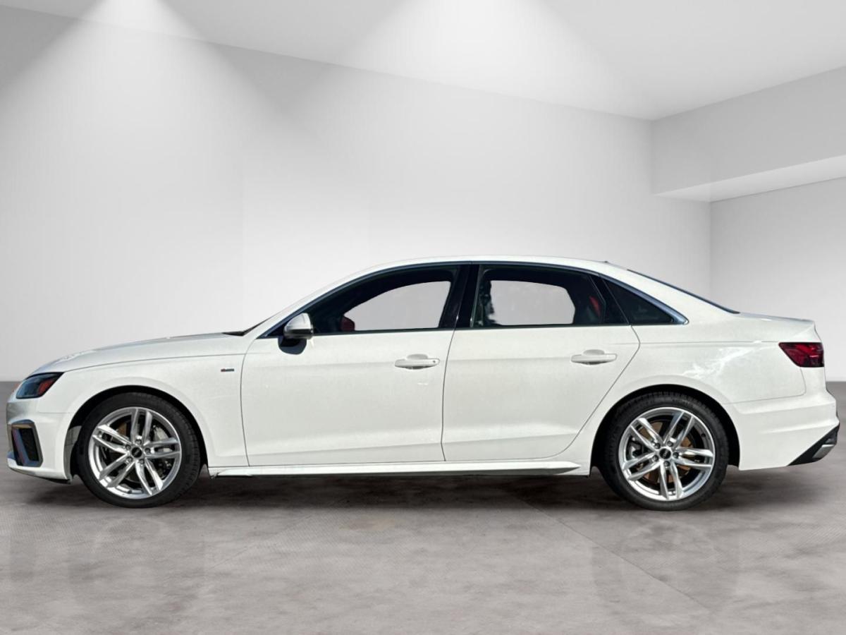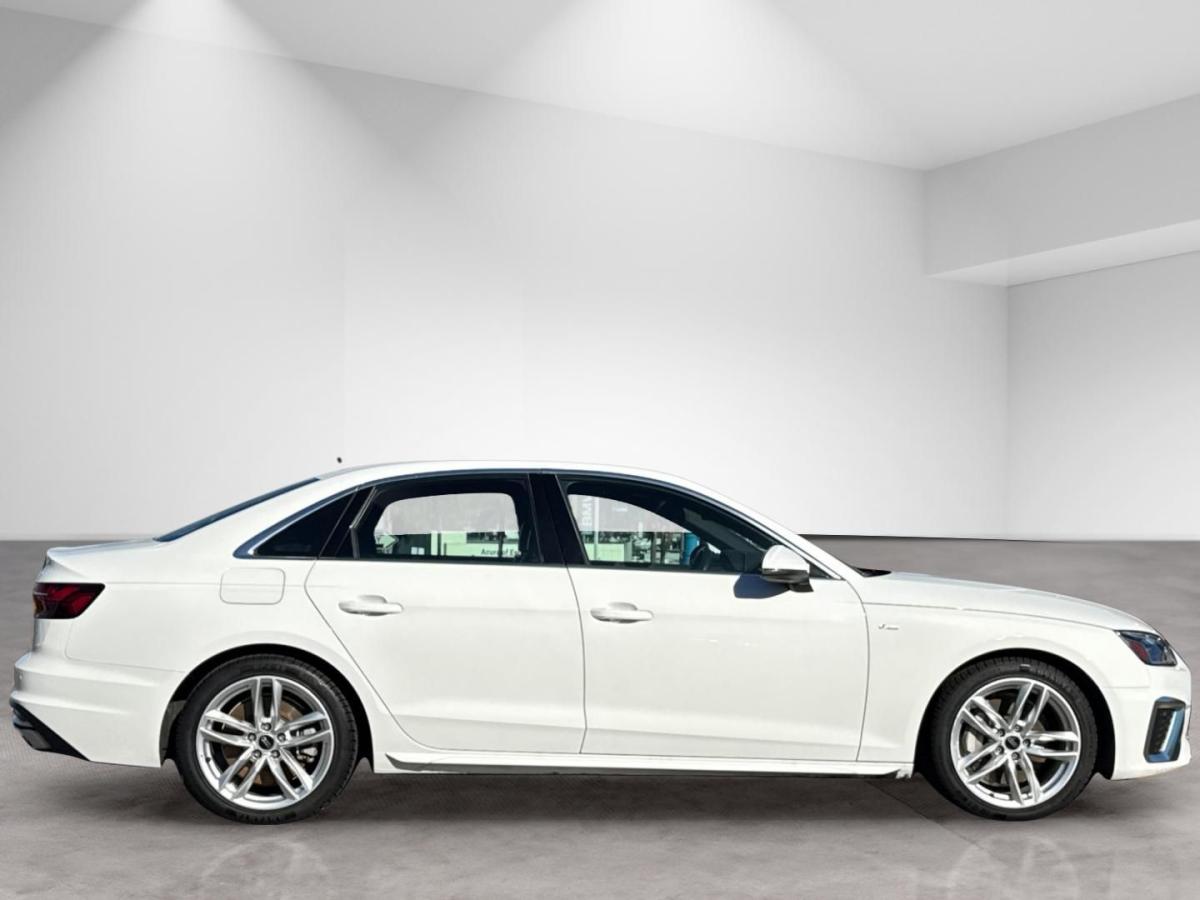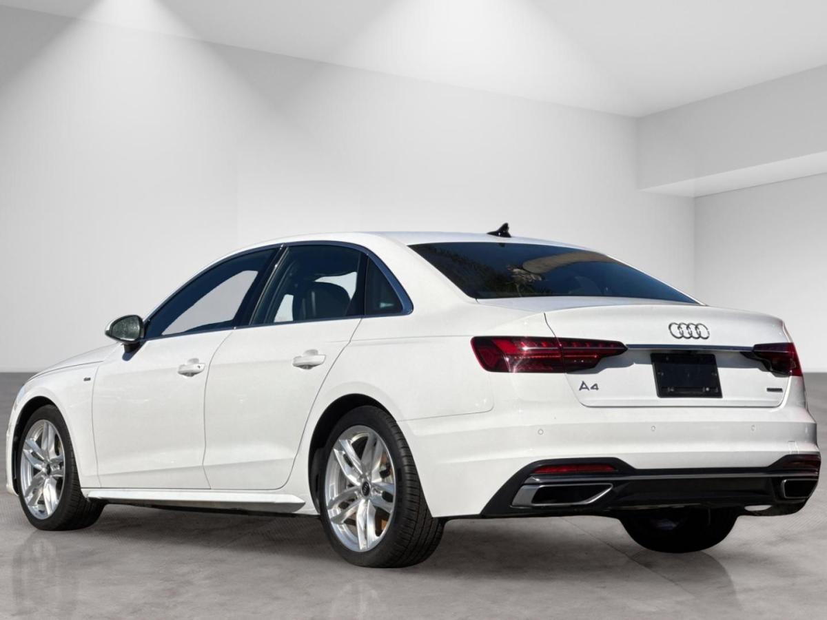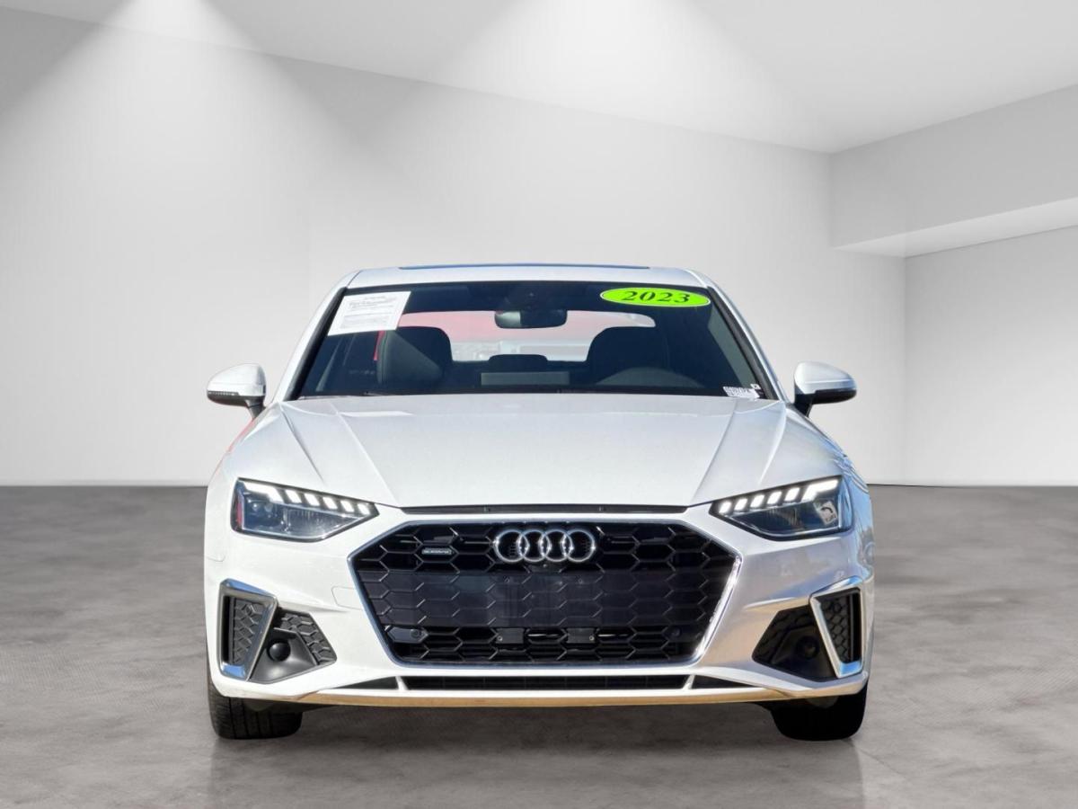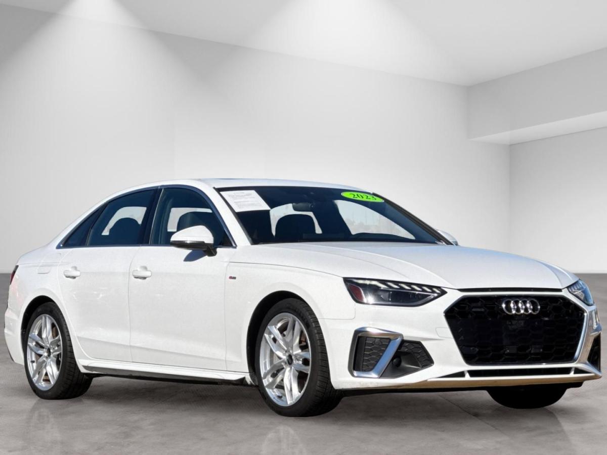 White 2023 Audi A4 45 S line Premium Plus quattro quattro 7-Speed Automatic S tronic 2.0L TFSI 7-Speed Automatic S tronic, quattro, Black Leather, 10 Speakers, 2 Rear USB Charge Ports, Adaptive Cruise Control, Alarm System w/Motion Sensor, Alloy wheels, Audi Active Lane Assist, Audi Advanced Key, Audi Phone Box, Audi Side Assist w/Pre Sense Rear, Audi Virtual Cockpit Plus, Auto-Dimming Exterior Mirrors w/Memory, Automatic temperature control, Bang & Olufsen Sound System w/3D Sound, Convenience Package, Exterior Parking Camera Rear, Front dual zone A/C, Front fog lights, Garage door transmitter: HomeLink, Hands-On Detection Steering Wheel, Heated front seats, Heated Front Sport Bucket Seats, Heated Rear Seats, Heated Steering Wheel, Leather Seating Surfaces, Leatherette Covered Center Console & Door Armrests, Memory for Driver's Seat, Parking System Plus, Power Folding Exterior Mirrors, Power moonroof, Power passenger seat, Premium Plus Package, Rain sensing wipers, SiriusXM w/360L, Top View Camera System, Traffic Jam Assist, Wheels: 18" 5-Double-Spoke Design.24/32 City/Highway MPG