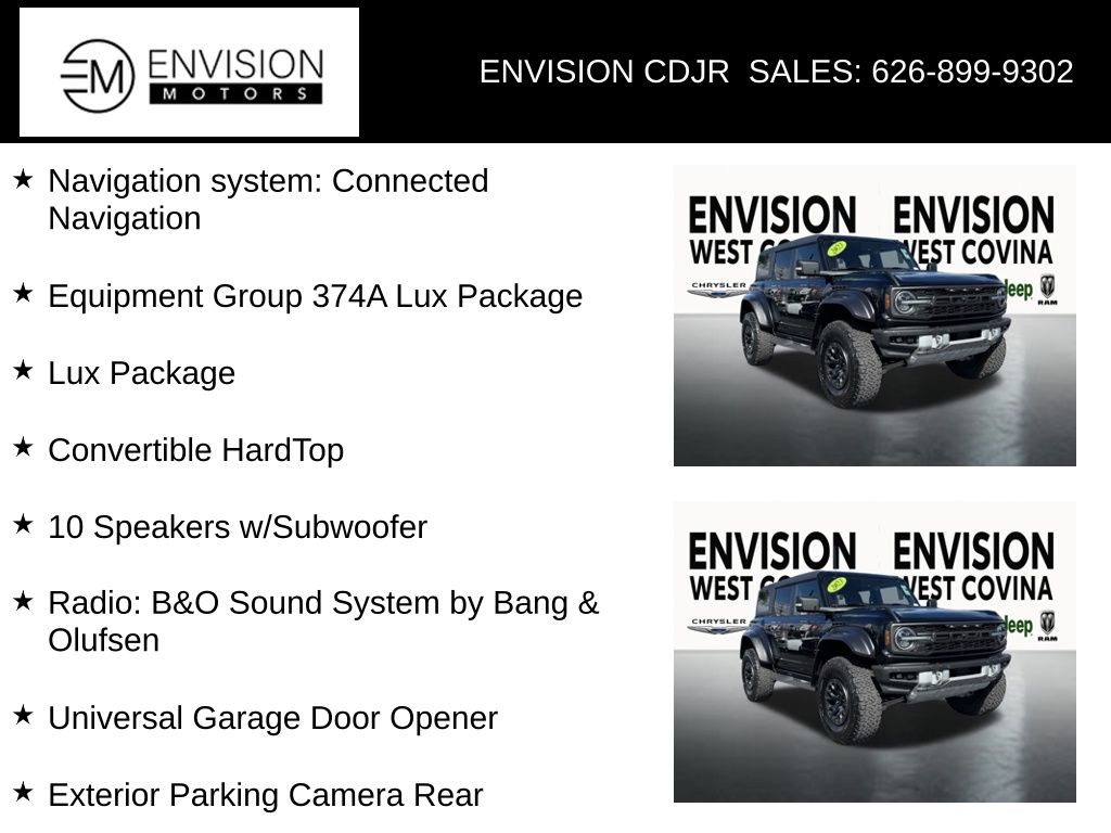 WE SPECIALIZE IN ALL CREDIT PROFILES! See what we can do for you! Call to find out (626) 899-9302.Recent Arrival!10 Speakers w/Subwoofer, 2 Smart Charging USB Ports In Dashboard, Adaptive Cruise Control, Connected Built-In Navigation, Convertible HardTop, Equipment Group 374A Lux Package, Evasive Steering Assist, Exterior Parking Camera Rear, Heated Steering Wheel, Lux Package, Navigation system: Connected Navigation, Radio: B&O Sound System by Bang & Olufsen, Universal Garage Door Opener, Wheels: 17" Dark Carbonized Gray Alloy Painted, Wireless Charging Pad.Shadow Black2023 Ford Bronco Raptor 4WD 10-Speed Automatic 3.0L EcoBoost V6**********All Pricing and Advertised Prices for any/all vehicles offered for sale does not include dealer installed accessories which can be purchased for an additional cost.********** The Factory Rebates may not be available on this vehicle if you elect to take advantage of a Special Alternative APR or Special Lease program. Some Factory Rebates are California Resident specific and may vary for residents of other states. NO sales to Dealers, Brokers or Exporters. For out of state purchase, customers must be present to purchase. If shipping is required, dealership must facilitate; no exceptions. Please contact us for special Multi-Vehicle or Fleet pricing. Prices are plus government fees and taxes, any finance charges, $85 documentary fee, $29 electronic registration fee, any emission testing charge and $1.75 per new tire state tire fee. *** We make every effort to provide accurate information, but please verify before purchasing. Leasing & financing available on approved credit. Trade-ins accepted. Subject to prior sale.