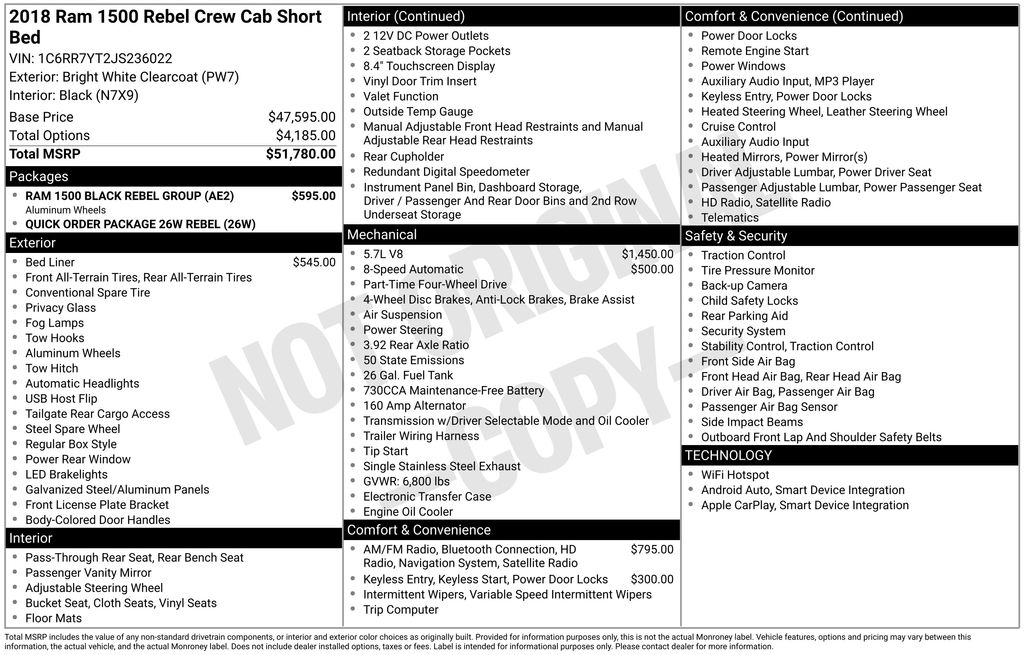 Bright White Clearcoat 2018 Ram 1500 Rebel 4WD 8-Speed Automatic HEMI 5.7L V8 Multi Displacement VVT Black Powder-Coated Front Bumper, Dual Rear Exhaust w/Bright Tips, Flat Black 5.7L Hemi Badge, GPS Navigation, Heated front seats, Keyless Enter-N-Go, Panic alarm, ParkView Rear Back-Up Camera, Power passenger seat, Quick Order Package 26W Rebel, RAM 1500 Black Rebel Group, Remote Proximity Keyless Entry, Security system, Wheels: 17" x 8" Matte Black Aluminum.Recent Arrival!