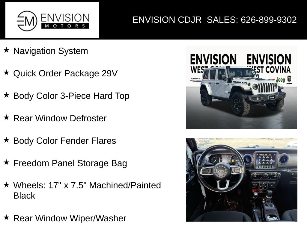 WE SPECIALIZE IN ALL CREDIT PROFILES! See what we can do for you! Call to find out (626) 899-9302.Certified. CARFAX One-Owner.2.0L I4 DOHC, Body Color 3-Piece Hard Top, Body Color Fender Flares, Freedom Panel Storage Bag, Navigation System, Quick Order Package 29V, Rear Window Defroster, Rear Window Wiper/Washer, Wheels: 17" x 7.5" Machined/Painted Black.Bright White Clearcoat2021 Jeep Wrangler Unlimited Rubicon 4xe 4WD 8-Speed Automatic 2.0L I4 DOHCFCA US LLC Certified Pre-Owned Details: * Transferable Warranty * Warranty Deductible: $100 * Powertrain Limited Warranty: 84 Month/100,000 Mile (whichever comes first) from original in-service date * Roadside Assistance * Vehicle History * Limited Warranty: 3 Month/3,000 Mile (whichever comes first) after new car warranty expires or from certified purchase date * Vehicles Up to 75,000 Miles and/or 5 Model Years. 24-Hour Towing & Roadside Assistance, Car Rental Allowance, CARFAX® Vehicle History ReportTM and an Introductory 3-month Subscription to SiriusXM® Satellite Radio & Certified Warranty Upgrades * 125 Point Inspection**********All Pricing and Advertised Prices for any/all vehicles offered for sale does not include dealer installed accessories which can be purchased for an additional cost.********** The Factory Rebates may not be available on this vehicle if you elect to take advantage of a Special Alternative APR or Special Lease program. Some Factory Rebates are California Resident specific and may vary for residents of other states. NO sales to Dealers, Brokers or Exporters. For out of state purchase, customers must be present to purchase. If shipping is required, dealership must facilitate; no exceptions. Please contact us for special Multi-Vehicle or Fleet pricing. Prices are plus government fees and taxes, any finance charges, $85 documentary fee, $29 electronic registration fee, any emission testing charge and $1.75 per new tire state tire fee. *** We make every effort to provide accurate information, but please verify before purchasing. Leasing & financing available on approved credit. Trade-ins accepted. Subject to prior sale.