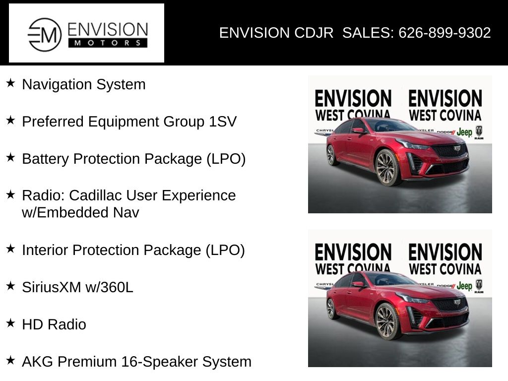 WE SPECIALIZE IN ALL CREDIT PROFILES! See what we can do for you! Call to find out (626) 899-9302.CARFAX One-Owner. Clean CARFAX.16 Speakers, 3 USB Ports, 3.73 Rear Axle Ratio, AKG Premium 16-Speaker System, All-Weather Cargo Mat (LPO), All-Weather Floor Mats, Automatic Emergency Braking, Battery Protection Package (LPO), Brembo 4-Wheel Antilock Performance Disc Brakes, Electronic Cruise Control w/Set & Resume Speed, Front & Rear Park Assist, HD Radio, Heads-Up Display, Heated Driver & Front Passenger Seats, Inside Rear-View Auto-Dimming Mirror, Interior Protection Package (LPO), Lane Keep Assist w/Lane Departure Warning, Leather-Wrapped Thick Rim Steering Wheel, Navigation System, Preferred Equipment Group 1SV, Radio: Cadillac User Experience w/Embedded Nav, SiriusXM w/360L, Speed-sensing steering, Sueded Microfiber Shifter, Sueded Microfiber Steering Wheel, Teen Driver, UltraView Dual Pane Sunroof, Ventilated Driver & Front Passenger Seats, Wheels: 19" Alum Alloy w/Polished/Dk Android Finish.Radiant Red Tintcoat2023 Cadillac CT5 V-Series RWD 6-Speed Manual 6.2L V8 Supercharged**********All Pricing and Advertised Prices for any/all vehicles offered for sale does not include dealer installed accessories which can be purchased for an additional cost.********** The Factory Rebates may not be available on this vehicle if you elect to take advantage of a Special Alternative APR or Special Lease program. Some Factory Rebates are California Resident specific and may vary for residents of other states. NO sales to Dealers, Brokers or Exporters. For out of state purchase, customers must be present to purchase. If shipping is required, dealership must facilitate; no exceptions. Please contact us for special Multi-Vehicle or Fleet pricing. Prices are plus government fees and taxes, any finance charges, $85 documentary fee, $29 electronic registration fee, any emission testing charge and $1.75 per new tire state tire fee. *** We make every effort to provide accurate information, but please verify before purchasing. Leasing & financing available on approved credit. Trade-ins accepted. Subject to prior sale.Awards: * Car and Driver 10 BestCar and Driver, January 2017.