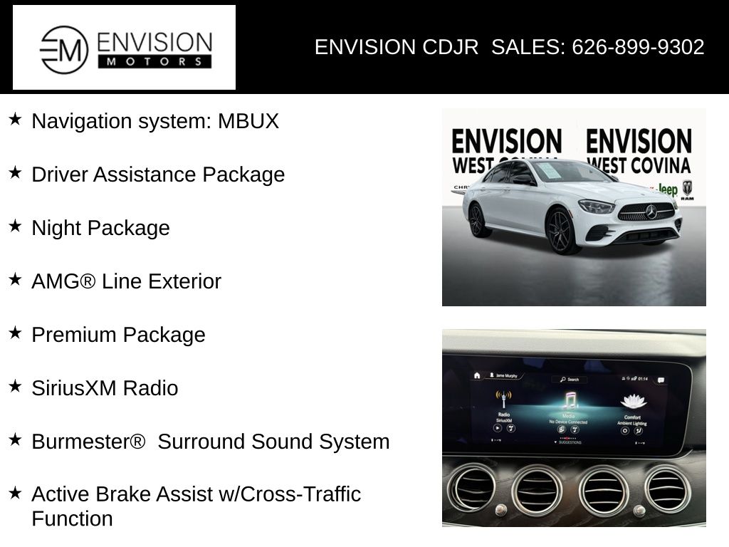 WE SPECIALIZE IN ALL CREDIT PROFILES! See what we can do for you! Call to find out (626) 899-9302.CARFAX One-Owner.Odometer is 9095 miles below market average! 23/31 City/Highway MPG Active Brake Assist w/Cross-Traffic Function, Active Distance Assist DISTRONIC®, Active Lane Change Assist, Active Speed Limit Assist, Active Steering Assist, AMG® Line Exterior, Burmester® Surround Sound System, Dashcam, Driver Assistance Package, Extended Restart in Stop & Go Traffic, HANDS-FREE ACCESS, Navigation system: MBUX, Night Package, Panorama Sunroof, PARKTRONIC w/Active Parking Assist, Perforated Front Brake Discs & Fr Brake Calipers, Power moonroof, PRE-SAFE® Impulse Side, PRE-SAFE® PLUS Rear-End Collision Protection, Premium Package, Route-Based Speed Adaptation w/End-of Traffic-Jam, SiriusXM Radio, Surround View System, Wheels: 18" x 8.0" Twin 5-Spoke.Polar White2022 Mercedes-Benz E-Class E 350 RWD 9-Speed Automatic I4**********All Pricing and Advertised Prices for any/all vehicles offered for sale does not include dealer installed accessories which can be purchased for an additional cost.********** The Factory Rebates may not be available on this vehicle if you elect to take advantage of a Special Alternative APR or Special Lease program. Some Factory Rebates are California Resident specific and may vary for residents of other states. NO sales to Dealers, Brokers or Exporters. For out of state purchase, customers must be present to purchase. If shipping is required, dealership must facilitate; no exceptions. Please contact us for special Multi-Vehicle or Fleet pricing. Prices are plus government fees and taxes, any finance charges, $85 documentary fee, $29 electronic registration fee, any emission testing charge and $1.75 per new tire state tire fee. *** We make every effort to provide accurate information, but please verify before purchasing. Leasing & financing available on approved credit. Trade-ins accepted. Subject to prior sale.