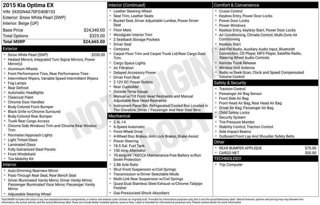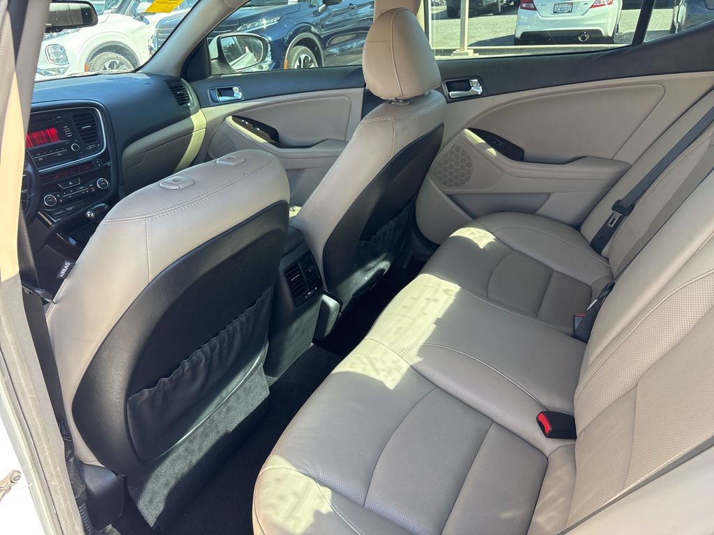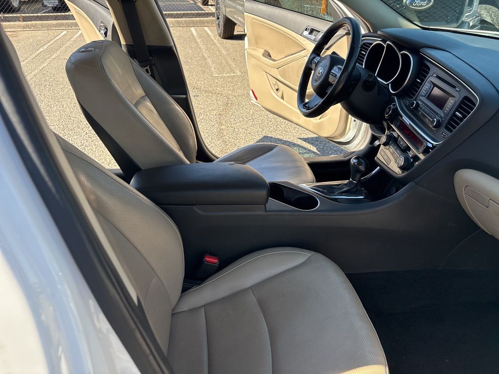 Snow White Pearl 2015 Kia Optima EX FWD 6-Speed Automatic with Sportmatic 2.4L I4 DGI DOHC Beige Leather.Recent Arrival! 23/34 City/Highway MPGAwards: * 2015 IIHS Top Safety Pick * 2015 KBB.com 10 Best UberX CandidatesReviews: * Looking for a practical family sedan that doesn’t look like a practical family sedan? You have a few cars from which to choose, but none as feature packed as the 2015 Kia Optima. Source: KBB.com * Lots of standard and optional features for the money; handsome cabin with easy-to-use controls and comfortable front seats; top crash scores; lengthy warranty. Source: Edmunds