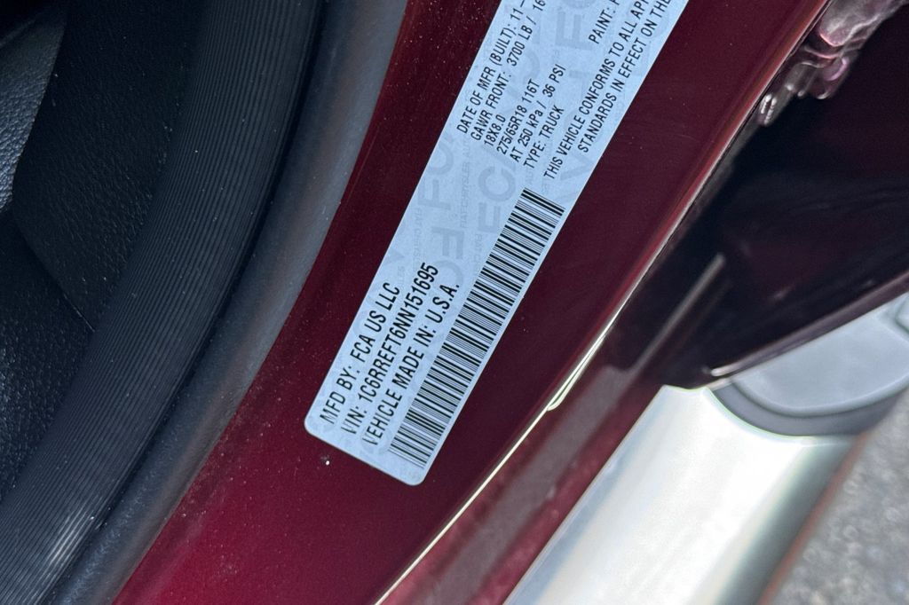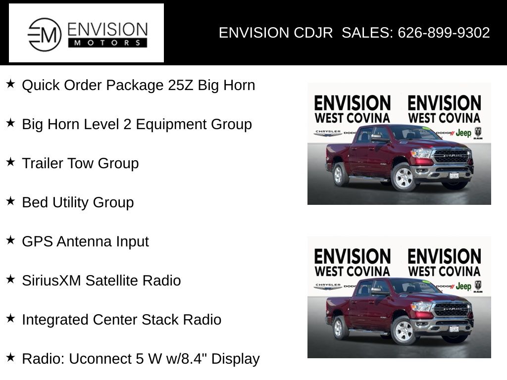 WE SPECIALIZE IN ALL CREDIT PROFILES! See what we can do for you! Call to find out (626) 899-9302.Certified. CARFAX One-Owner. Clean CARFAX.Odometer is 41236 miles below market average! 115V Auxiliary Power Outlet, 115V Auxiliary Rear Power Outlet, 2nd Row In Floor Storage Bins, 4-Corner Air Suspension, 400W Inverter, 4G LTE Wi-Fi Hot Spot, 8.4" Touchscreen Display, Air Conditioning ATC w/Dual Zone Control, Apple CarPlay, Auto-Dimming Exterior Driver Mirror, Auto-Dimming Rear-View Mirror, Bed Utility Group, Big Horn Badge, Big Horn Level 2 Equipment Group, Black Exterior Mirrors, Black Premium Power Mirrors, Bluetooth Handsfree Phone & Audio, Class IV Receiver Hitch, Cluster 7.0" TFT Color Display, Connectivity - US/Canada, Convex Wide-Angle Mirror Insert, Exterior Mirrors Courtesy Lamps, Exterior Mirrors w/Heating Element, Exterior Mirrors w/Supplemental Signals, For Details, Visit DriveUconnect.com, Global Telematics Box Module (TBM), Glove Box Lamp, Google Android Auto, GPS Antenna Input, Heated Front Seats, Heated Steering Wheel, Integrated Center Stack Radio, Media Hub w/2 Charge Only USBs, MOPAR 4 Adjustable Cargo Tie-Down Hooks, MOPAR Deployable Bed Step, MOPAR Spray In Bedliner, ParkSense Front/Rear Park Assist w/Stop, Pick-Up Box Lighting, Power 2-Way Driver Lumbar Adjust, Power 8-Way Driver Seat, Power Adjustable Pedals, Power-Folding Mirrors, Quick Order Package 25Z Big Horn, Radio: Uconnect 5 W w/8.4" Display, Rear Dome w/On/Off Switch Lamp, Rear Power Sliding Window, Rear Window Defroster, Remote Start System, Security Alarm, SiriusXM Radio Service, SiriusXM Satellite Radio, Sun Visors w/Illuminated Vanity Mirrors, Trailer Brake Control, Trailer Light Check, Trailer Reverse Steering Control, Trailer Tire Pressure Monitoring System, Trailer Tow Group, Universal Garage Door Opener, USB Host Flip.Delmonico Red Pearlcoat2022 Ram 1500 Big Horn/Lone Star RWD 8-Speed Automatic HEMI 5.7L V8 Multi Displacement VVTFCA US LLC Certified Pre-Owned Details: * Vehicle History * 125 Point Inspection * Transferable Warranty * Roadside Assistance * Vehicles Up to 75,000 Miles and/or 5 Model Years. 24-Hour Towing & Roadside Assistance, Car Rental Allowance, CARFAX® Vehicle History ReportTM and an Introductory 3-month Subscription to SiriusXM® Satellite Radio & Certified Warranty Upgrades * Limited Warranty: 3 Month/3,000 Mile (whichever comes first) after new car warranty expires or from certified purchase date * Powertrain Limited Warranty: 84 Month/100,000 Mile (whichever comes first) from original in-service date * Warranty Deductible: $100**********All Pricing and Advertised Prices for any/all vehicles offered for sale does not include dealer installed accessories which can be purchased for an additional cost.********** The Factory Rebates may not be available on this vehicle if you elect to take advantage of a Special Alternative APR or Special Lease program. Some Factory Rebates are California Resident specific and may vary for residents of other states. NO sales to Dealers, Brokers or Exporters. For out of state purchase, customers must be present to purchase. If shipping is required, dealership must facilitate; no exceptions. Please contact us for special Multi-Vehicle or Fleet pricing. Prices are plus government fees and taxes, any finance charges, $85 documentary fee, $29 electronic registration fee, any emission testing charge and $1.75 per new tire state tire fee. *** We make every effort to provide accurate information, but please verify before purchasing. Leasing & financing available on approved credit. Trade-ins accepted. Subject to prior sale.