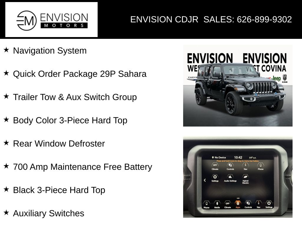 WE SPECIALIZE IN ALL CREDIT PROFILES! See what we can do for you! Call to find out (626) 899-9302.Certified. CARFAX One-Owner. Clean CARFAX.2.0L I4 DOHC, 7 & 4 Pin Wiring Harness, 700 Amp Maintenance Free Battery, Auxiliary Switches, Black 3-Piece Hard Top, Body Color 3-Piece Hard Top, Class II Receiver Hitch, Freedom Panel Storage Bag, Navigation System, Quick Order Package 29P Sahara, Rear Window Defroster, Rear Window Wiper/Washer, Trailer Tow & Aux Switch Group, Wheels: 20" x 8" Fully Painted Aluminum.Black Clearcoat2023 Jeep Wrangler Sahara 4xe 4WD 8-Speed Automatic 2.0L I4 DOHCFCA US LLC Certified Pre-Owned Details: * Vehicles Up to 75,000 Miles and/or 5 Model Years. 24-Hour Towing & Roadside Assistance, Car Rental Allowance, CARFAX® Vehicle History ReportTM and an Introductory 3-month Subscription to SiriusXM® Satellite Radio & Certified Warranty Upgrades * Limited Warranty: 3 Month/3,000 Mile (whichever comes first) after new car warranty expires or from certified purchase date * Vehicle History * Transferable Warranty * Roadside Assistance * 125 Point Inspection * Warranty Deductible: $100 * Powertrain Limited Warranty: 84 Month/100,000 Mile (whichever comes first) from original in-service date**********All Pricing and Advertised Prices for any/all vehicles offered for sale does not include dealer installed accessories which can be purchased for an additional cost.********** The Factory Rebates may not be available on this vehicle if you elect to take advantage of a Special Alternative APR or Special Lease program. Some Factory Rebates are California Resident specific and may vary for residents of other states. NO sales to Dealers, Brokers or Exporters. For out of state purchase, customers must be present to purchase. If shipping is required, dealership must facilitate; no exceptions. Please contact us for special Multi-Vehicle or Fleet pricing. Prices are plus government fees and taxes, any finance charges, $85 documentary fee, $29 electronic registration fee, any emission testing charge and $1.75 per new tire state tire fee. *** We make every effort to provide accurate information, but please verify before purchasing. Leasing & financing available on approved credit. Trade-ins accepted. Subject to prior sale.