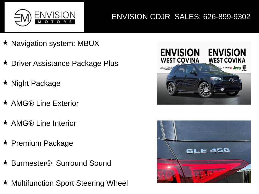 WE SPECIALIZE IN ALL CREDIT PROFILES! See what we can do for you! Call to find out (626) 899-9302.CARFAX One-Owner. Clean CARFAX.Odometer is 9799 miles below market average! 115V Power Outlet, Active Blind Spot Assist, Active Brake Assist w/Cross-Traffic Function, Active Distance Assist DISTRONIC®, Active Emergency Stop Assist, Active Lane Change Assist, Active Lane Keeping Assist, Active Speed Limit Assist, Active Steering Assist, Active Stop-and-Go Assist, AMG® Bodystyling, AMG® Floor Mats, AMG® Line Exterior, AMG® Line Interior, Burmester® Surround Sound, Driver Assistance Package Plus, Evasive Steering Assist, Multifunction Sport Steering Wheel, Navigation system: MBUX, Night Package, Panorama Power Tilt/Sliding Sunroof, Parking Assist Code, PRE-SAFE® PLUS Rear End Collision Protection, Premium Package, Route-Based Speed Adaptation, Surround View System, Traffic Sign Assist, Wheels: 21" AMG® Multispoke w/Black Accents.Black2023 Mercedes-Benz GLE GLE 450 4MATIC® 9-Speed Automatic 3.0L I6 Turbo**********All Pricing and Advertised Prices for any/all vehicles offered for sale does not include dealer installed accessories which can be purchased for an additional cost.********** The Factory Rebates may not be available on this vehicle if you elect to take advantage of a Special Alternative APR or Special Lease program. Some Factory Rebates are California Resident specific and may vary for residents of other states. NO sales to Dealers, Brokers or Exporters. For out of state purchase, customers must be present to purchase. If shipping is required, dealership must facilitate; no exceptions. Please contact us for special Multi-Vehicle or Fleet pricing. Prices are plus government fees and taxes, any finance charges, $85 documentary fee, $29 electronic registration fee, any emission testing charge and $1.75 per new tire state tire fee. *** We make every effort to provide accurate information, but please verify before purchasing. Leasing & financing available on approved credit. Trade-ins accepted. Subject to prior sale.