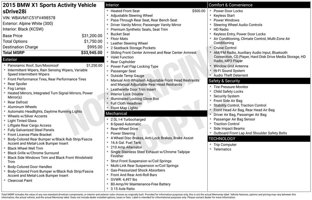 Alpine White 2015 BMW X1 sDrive28i RWD 8-Speed Automatic Steptronic 2.0L 4-Cylinder DOHC 16V TwinPower TurboRecent Arrival! 23/34 City/Highway MPGReviews: * If you want a small 5-passenger SUV that offers European badge appeal and more than just lip service to road-going performance, the X1 is a tempting choice. Models equipped with the 4-cylinder are surprisingly fuel-efficient, too. Source: KBB.com * Strong engines; sport sedan-like handling; quick acceleration; good fuel economy. Source: Edmunds
