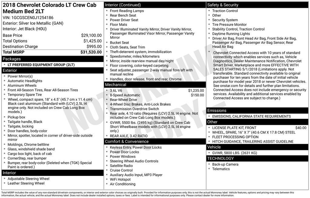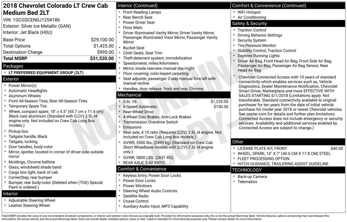 Discover the perfect blend of power, capability, and comfort in this 2018 Chevrolet Colorado LT. With its robust V6 engine, smooth 8-speed automatic transmission, and rear-wheel drive, this Colorado is ready to tackle any task with confidence. Whether you're hauling heavy loads, navigating rough terrain, or simply enjoying the open road, this truck delivers an exceptional driving experience.Key features of this Colorado LT include:• 3.6L V6 engine with direct injection and variable valve timing• 8-speed automatic transmission• Front License Plate Kit• Hitch Guidance• Tow/Haul ModeInside, you'll find a well-appointed cabin that combines style and functionality. Enjoy the convenience of the Chevrolet MyLink premium audio system with an 8-inch color touch screen, SiriusXM satellite radio, and seamless integration with Apple CarPlay. Stay connected and in control with the steering wheel-mounted audio controls and the power driver's seat. Dual-zone climate control and the center console armrest add to the overall comfort and refinement.Safety is a top priority, and this Colorado LT delivers. It features a suite of advanced safety technologies, including ABS brakes, electronic stability control, and a rearview camera. You can drive with confidence, knowing that you and your passengers are well-protected.Whether you're tackling tough jobs or embarking on weekend adventures, this 2018 Chevrolet Colorado LT is the perfect companion. With its impressive capabilities, thoughtful features, and refined design, it's a truck that can truly do it all. Experience the power and versatility for yourself by scheduling a test drive today.