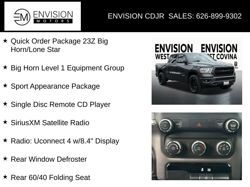 WE SPECIALIZE IN ALL CREDIT PROFILES! See what we can do for you! Call to find out (626) 899-9302.Certified. CARFAX One-Owner. Clean CARFAX.Odometer is 4935 miles below market average! 3 Rear Seat Head Restraints, 4 Way Front Headrests, Auto-Dimming Exterior Driver Mirror, Auto-Dimming Rear-View Mirror, Big Horn IP Badge, Big Horn Level 1 Equipment Group, Black Interior Accents, Body Color Door Handles, Body Color Front Bumper, Body Color Rear Bumper w/Step Pads, Bucket Seats, Center Console Parts Module, Class IV Receiver Hitch, Cluster 3.5" TFT Color Display, Deluxe Cloth Bucket Seats, Exterior Mirrors Courtesy Lamps, Exterior Mirrors w/Memory, Exterior Mirrors w/Supplemental Signals, Foam Bottle Insert (Door Trim Panel), Front Seat Back Map Pockets, Full Length Floor Console, Glove Box Lamp, Grille B/Color Outline 1 Texture 2, Manual Adjust 4-Way Front Passenger Seat, Power 4-Way Driver Lumbar Adjust, Power 8-Way Driver Seat, Power Adjustable Pedals, Power Heated Fold Away Mirrors, Power Heated Fold-Away Mirrors, Power-Folding Mirrors, Quick Order Package 23Z Big Horn/Lone Star, Radio: Uconnect 4 w/8.4" Display, Rear 60/40 Folding Seat, Rear Dome w/On/Off Switch Lamp, Rear Power Sliding Window, Rear Window Defroster, Single Disc Remote CD Player, SiriusXM Satellite Radio, Sport Appearance Package, Steering Wheel Mounted Audio Controls, Sun Visors w/Illuminated Vanity Mirrors, Universal Garage Door Opener, Wheels: 20" x 9" Aluminum Chrome Clad.Granite Crystal Metallic Clearcoat2019 Ram 1500 Big Horn/Lone Star RWD 8-Speed Automatic 3.6L V6 24V VVTFCA US LLC Certified Pre-Owned Details: * Powertrain Limited Warranty: 84 Month/100,000 Mile (whichever comes first) from original in-service date * Roadside Assistance * 125 Point Inspection * Vehicles Up to 75,000 Miles and/or 5 Model Years. 24-Hour Towing & Roadside Assistance, Car Rental Allowance, CARFAX® Vehicle History ReportTM and an Introductory 3-month Subscription to SiriusXM® Satellite Radio & Certified Warranty Upgrades * Warranty Deductible: $100 * Transferable Warranty * Vehicle History * Limited Warranty: 3 Month/3,000 Mile (whichever comes first) after new car warranty expires or from certified purchase date**********All Pricing and Advertised Prices for any/all vehicles offered for sale does not include dealer installed accessories which can be purchased for an additional cost.********** The Factory Rebates may not be available on this vehicle if you elect to take advantage of a Special Alternative APR or Special Lease program. Some Factory Rebates are California Resident specific and may vary for residents of other states. NO sales to Dealers, Brokers or Exporters. For out of state purchase, customers must be present to purchase. If shipping is required, dealership must facilitate; no exceptions. Please contact us for special Multi-Vehicle or Fleet pricing. Prices are plus government fees and taxes, any finance charges, $85 documentary fee, $29 electronic registration fee, any emission testing charge and $1.75 per new tire state tire fee. *** We make every effort to provide accurate information, but please verify before purchasing. Leasing & financing available on approved credit. Trade-ins accepted. Subject to prior sale.Awards: * Motor Trend Automobiles of the year * NACTOY 2019 North American Truck of the Year * 2019 KBB.com 10 Best Road Trip Cars * 2019 KBB.com 10 Favorite New-for-2019 Cars * 2019 KBB.com Best Auto Tech Awards