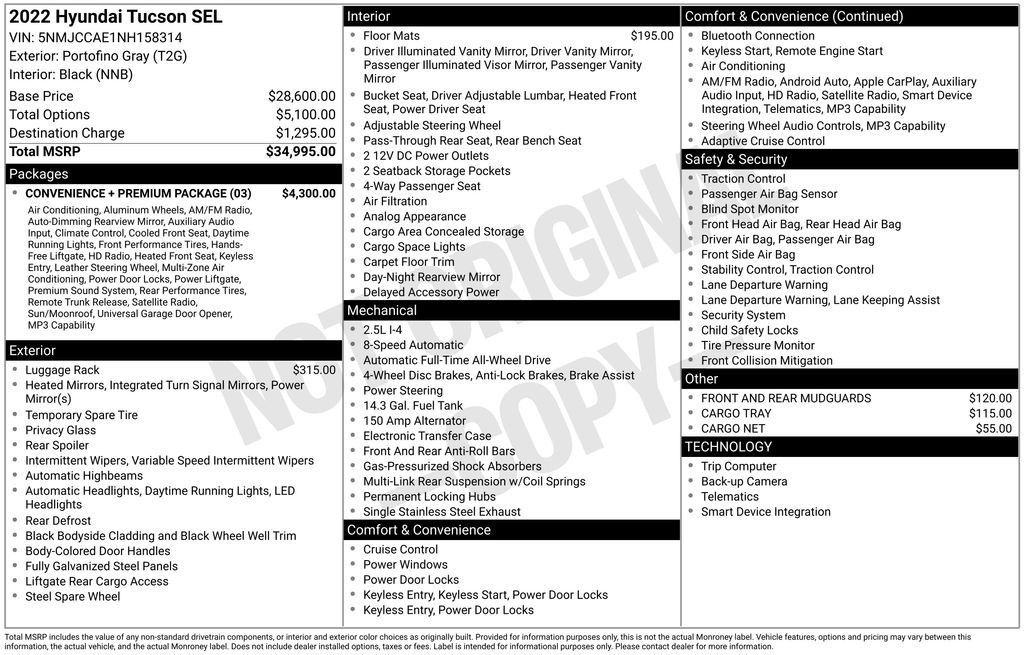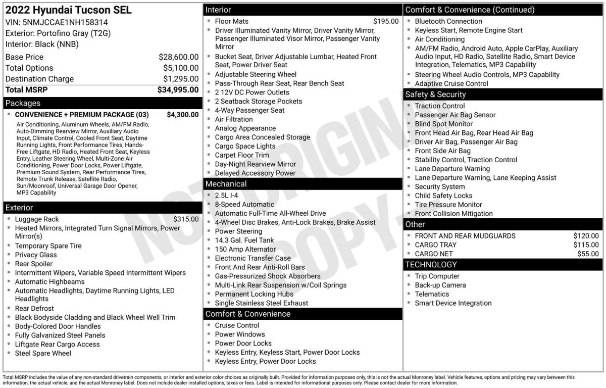 Portofino Gray 2022 Hyundai Tucson SEL AWD 8-Speed Automatic with SHIFTRONIC 2.5L I4 DGI DOHC 16V LEV3-ULEV70 187hp AWD, 6 Speakers, Alloy wheels, Convenience + Premium Package, Dark Chrome Grille & H-Logo, Heated Front Bucket Seats, Heated front seats, Leather Seat Trim, Option Group 03, Power driver seat, Premium 5-LED DRLs, Radio: Bose Premium Audio System w/AM/FM/HD, Remote keyless entry, Spoiler, Ventilated Front Seats, Wheels: 17" x 7.0J" Alloy.Odometer is 820 miles below market average! 24/29 City/Highway MPG