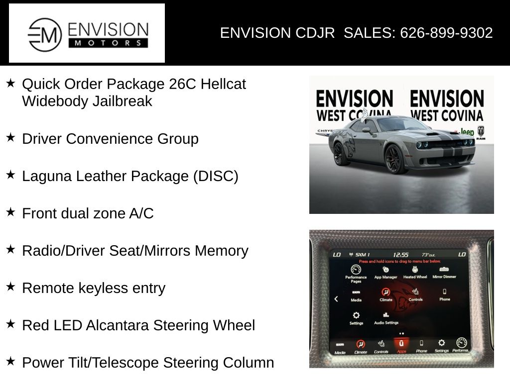 WE SPECIALIZE IN ALL CREDIT PROFILES! See what we can do for you! Call to find out (626) 899-9302.CARFAX One-Owner. Clean CARFAX.ABS brakes, Alloy wheels, Black Seat Belts, Blind Spot & Cross Path Detection, Body Color Exterior Mirrors, Compass, Driver Convenience Group, Electronic Stability Control, Exterior Mirrors w/Heating Element, Front dual zone A/C, Heated door mirrors, Heated Front Seats, Heated front seats, Heated Steering Wheel, Hellcat Logo Laguna Leather Seat, High-Intensity Discharge Headlamps, Illuminated entry, Jailbreak IP Badge, Laguna Leather Package (DISC), Low tire pressure warning, ParkView Rear Back-Up Camera, Power Multi-Function Foldaway Mirrors, Power Tilt/Telescope Steering Column, Premium Laguna Door Trim Panel, Premium-Stitched Dash Panel, Quick Order Package 26C Hellcat Widebody Jailbreak, Radio/Driver Seat/Mirrors Memory, Red LED Alcantara Steering Wheel, Remote keyless entry, Traction control, Ventilated Front Seats, Wheels: 20" x 11.0" Devil's Rim Granite, Widebody Competition Suspension, Widebody Fender Flares.Destroyer Gray Clearcoat2023 Dodge Challenger SRT Hellcat Widebody RWD 8-Speed Automatic 6.2L 8-Cylinder SMPI Supercharged OHV**********All Pricing and Advertised Prices for any/all vehicles offered for sale does not include dealer installed accessories which can be purchased for an additional cost.********** The Factory Rebates may not be available on this vehicle if you elect to take advantage of a Special Alternative APR or Special Lease program. Some Factory Rebates are California Resident specific and may vary for residents of other states. NO sales to Dealers, Brokers or Exporters. For out of state purchase, customers must be present to purchase. If shipping is required, dealership must facilitate; no exceptions. Please contact us for special Multi-Vehicle or Fleet pricing. Prices are plus government fees and taxes, any finance charges, $85 documentary fee, $29 electronic registration fee, any emission testing charge and $1.75 per new tire state tire fee. *** We make every effort to provide accurate information, but please verify before purchasing. Leasing & financing available on approved credit. Trade-ins accepted. Subject to prior sale.