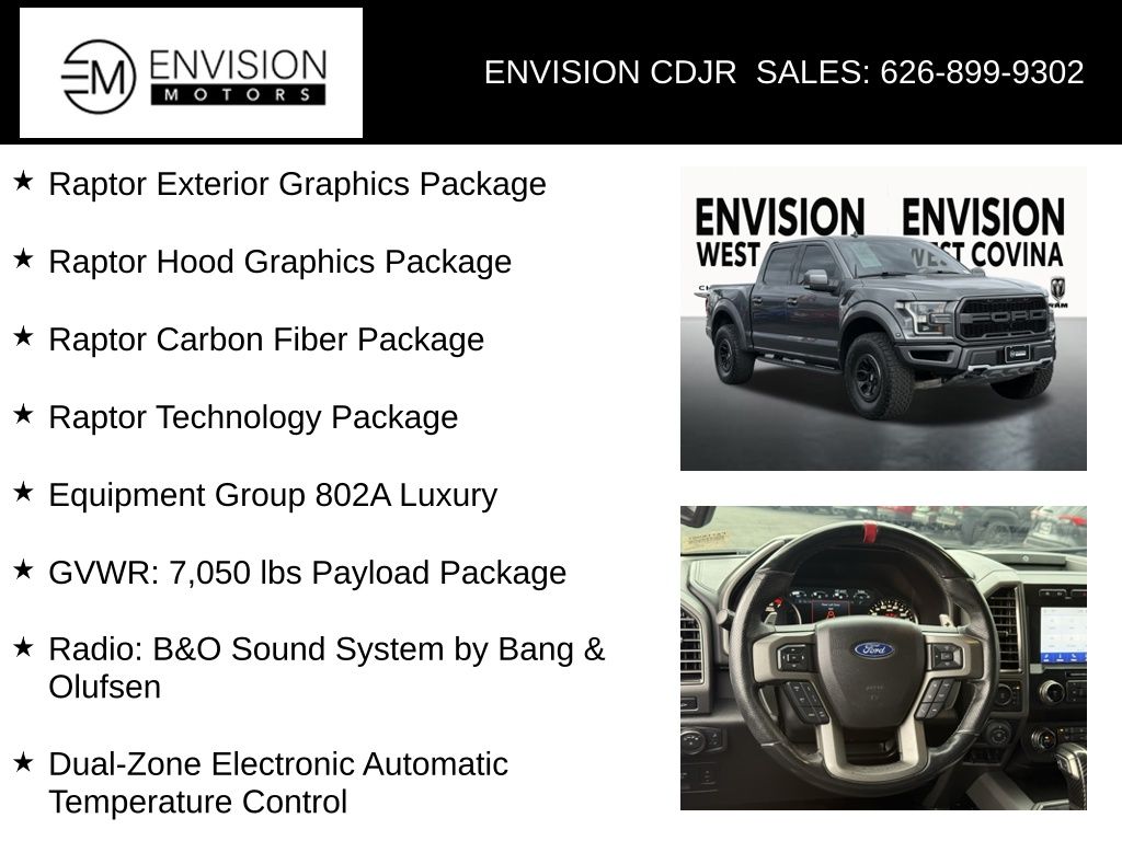 WE SPECIALIZE IN ALL CREDIT PROFILES! See what we can do for you! Call to find out (626) 899-9302.Clean CARFAX.4WD, 10-Way Power Driver & Passenger Seats, 360 Degree Camera, 4.10 Front Axle w/Torsen Differential, 8" Productivity Screen, Adaptive Cruise Control w/Stop-and-Go, Advanced Security Pack, Ambient Lighting - Ice Blue Color Only, BLIS Blind Spot Information System, Dual-Zone Electronic Automatic Temperature Control, Equipment Group 802A Luxury, GVWR: 7,050 lbs Payload Package, Heated & Ventilated Leather 40/Console/40 Front Seats, Heated Steering Wheel, Inflatable Rear Safety Belts, Integrated Trailer Brake Controller, Intelligent Access w/Push-Button Start, Lane Keeping System w/Alert & Assist, LED Box Lighting, LED Sideview Mirror Spotlights, Memory System (Seat, Pedal, Exterior Mirror), Power Glass Heated Sideview Mirrors, Power Tilt/Telescoping Steering Column w/Memory, Power-Adjustable Pedals, Power-Sliding Rear Window, Pro Trailer Backup Assist, Radio: B&O Sound System by Bang & Olufsen, Rain-Sensing Windshield Wipers, Raptor Carbon Fiber Package, Raptor Exterior Graphics Package, Raptor Hood Graphics Package, Raptor Technology Package, Remote Start System w/Remote Tailgate Release, SYNC 3, Tailgate Applique FORD, Twin Panel Moonroof, Unique High Gloss Black Carbon Fiber Shift Knob, Universal Garage Door Opener, Voice-Activated Touchscreen Navigation.Magnetic Metallic2019 Ford F-150 Raptor 4WD 10-Speed Automatic 3.5L V6 EcoBoost**********All Pricing and Advertised Prices for any/all vehicles offered for sale does not include dealer installed accessories which can be purchased for an additional cost.********** The Factory Rebates may not be available on this vehicle if you elect to take advantage of a Special Alternative APR or Special Lease program. Some Factory Rebates are California Resident specific and may vary for residents of other states. NO sales to Dealers, Brokers or Exporters. For out of state purchase, customers must be present to purchase. If shipping is required, dealership must facilitate; no exceptions. Please contact us for special Multi-Vehicle or Fleet pricing. Prices are plus government fees and taxes, any finance charges, $85 documentary fee, $29 electronic registration fee, any emission testing charge and $1.75 per new tire state tire fee. *** We make every effort to provide accurate information, but please verify before purchasing. Leasing & financing available on approved credit. Trade-ins accepted. Subject to prior sale.Awards: * JD Power Automotive Performance, Execution and Layout (APEAL) Study