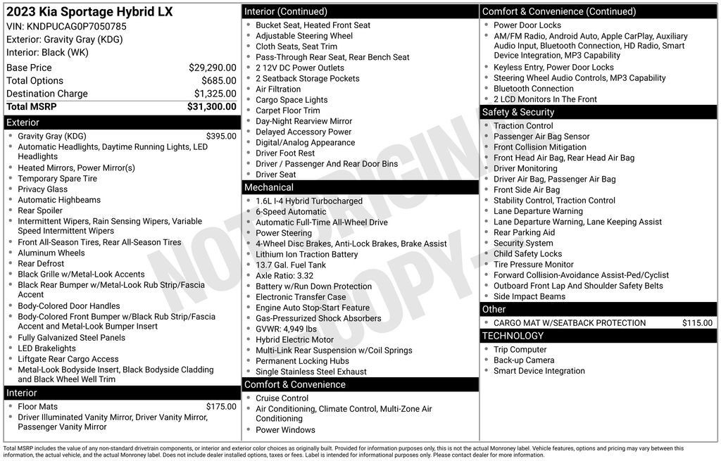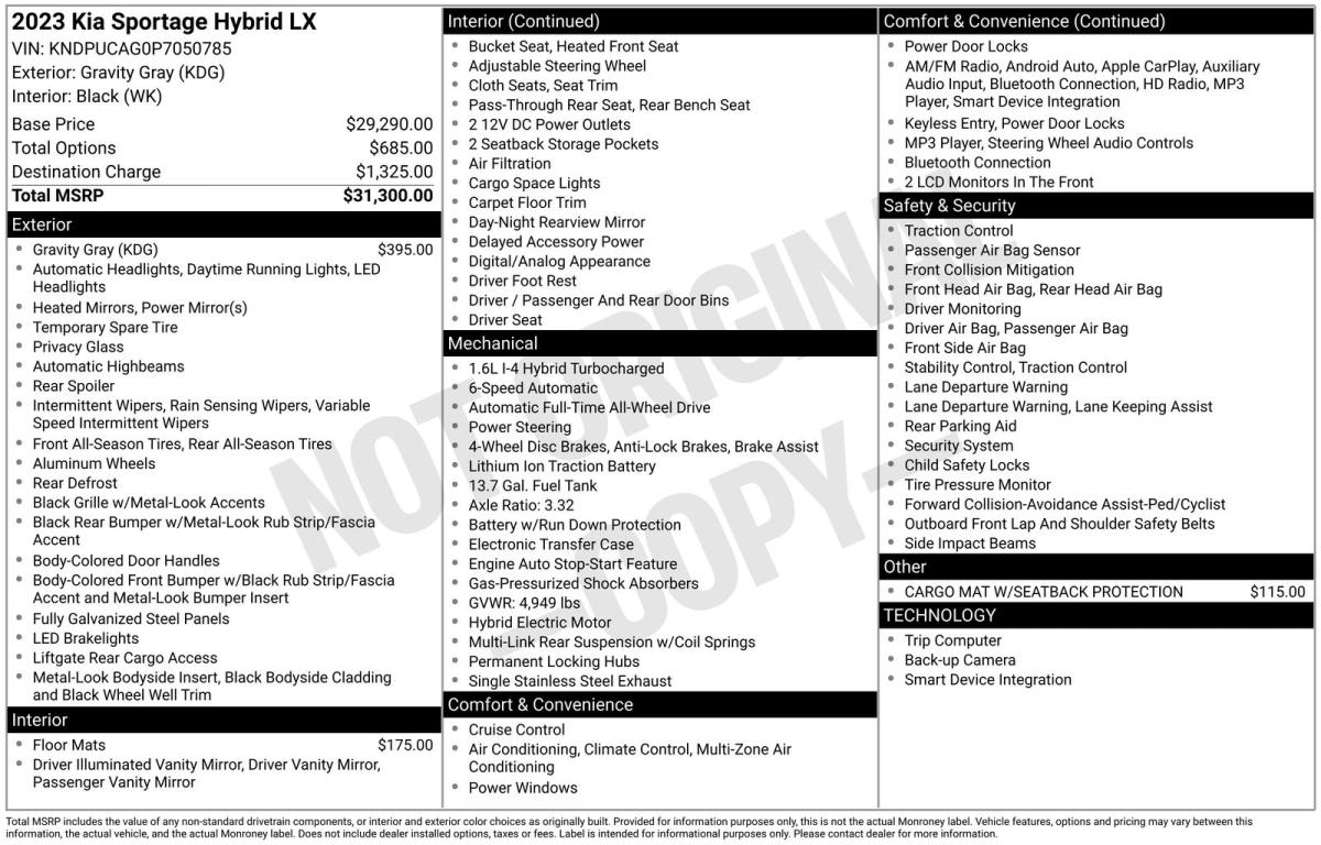 2023 Kia Sportage Hybrid LX AWDThis Sportage Hybrid LX AWD opens strong with a clean CARFAX 1 owner history, no accidents or damage, recent full service, all wheel drive capability, and active hybrid and drivetrain warranty coverage. It also received fresh maintenance including oil and filter change, new tires, cabin and engine air filters, and a full inspection at Aaron Ford of Poway. This SUV delivers excellent fuel economy, strong safety features, and long term dependability backed by remaining manufacturer hybrid system coverage. Finished in Gravity Gray with a clean black interior and equipped with wireless Apple CarPlay and Android Auto on an eight inch touchscreen, it offers outstanding everyday value for anyone who wants a reliable hybrid SUV without the new car price.The exterior presents well with Gravity Gray paint, LED lighting, deep tinted glass, and a clean modern design. The body and interior both reflect consistent highway use which is typically easier on a vehicle than short city driving. Inside you get comfortable seating, practical cargo space, six speaker audio, wireless connectivity, voice recognition, digital speedometer, and a user friendly cabin layout. The AWD system combined with drive modes including snow provides additional traction and confidence in changing weather or terrain.The hybrid powertrain is one of the biggest advantages of this Sportage. It delivers excellent fuel efficiency while maintaining the capability of an AWD SUV. The active hybrid and drivetrain warranty coverage give buyers meaningful protection that most used vehicles in this price range simply do not offer. Recent CARFAX documented service and the pre delivery inspection performed here at the dealership confirm the SUV is ready for its next owner. Safety features include Forward Collision Avoidance Assist with pedestrian and cyclist detection, rear view monitor with parking guidance, curtain airbags, child safety locks, and a tire pressure monitoring system.This Sportage Hybrid LX AWD is ideal for anyone who wants efficiency, comfort, and long term dependability with the added traction of AWD. With clean history, active warranty coverage, recent service, and modern technology, it stands out as a smart choice for budget conscious shoppers. Call or email to schedule a visit and see why hybrids in this condition do not stay available for long.Family Owned ~ Community Driven ~ You Get More at Aaron Ford of Poway. All vehicles are subject to prior sale. Price does not include applicable government fees and taxes finance charges 30 electronic filing charges 85 document fee and emission testing charges.
