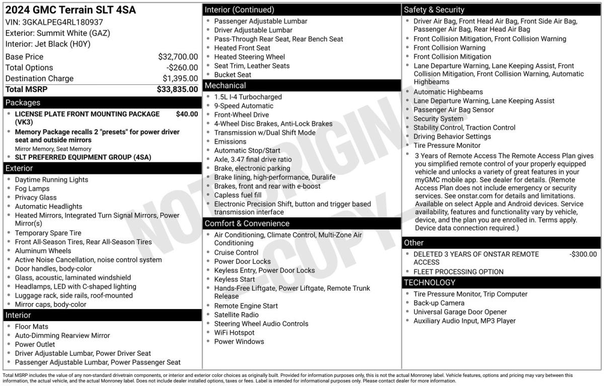 Discover the exceptional 2024 GMC Terrain SLT, a versatile and well-equipped SUV that seamlessly blends style, performance, and convenience. This stunning white model boasts a 1.5L DOHC engine paired with a 9-speed automatic transmission, delivering a smooth and efficient driving experience.Elevate your commute with an array of premium features, including:- Apple CarPlay and Android Auto- License Plate Front Mounting Package- Preferred Equipment Group 4SA- Navigation SystemThe Terrain SLT's spacious interior and thoughtful design cater to your every need. Enjoy the comfort of the perforated leather-appointed seats, the convenience of the power liftgate, and the connectivity of the 8-inch GMC Infotainment Audio System. Stay connected with SiriusXM radio and the OnStar and GMC connected services, while the dual-zone automatic climate control ensures a personalized environment.Safety is paramount in the Terrain SLT, with features like the emergency communication system, front and side impact airbags, and electronic stability control working together to provide you and your loved ones with peace of mind on the road.Elevate your driving experience with the Terrain SLT's exceptional handling and performance. The four-wheel independent suspension and speed-sensing steering deliver a responsive and confident ride, while the 4-wheel disc brakes with ABS ensure reliable stopping power.Discover the perfect blend of style, technology, and capability in the 2024 GMC Terrain SLT. This SUV is the embodiment of versatility, designed to enhance your everyday adventures and leave a lasting impression. Visit our showroom today and let us demonstrate how the Terrain SLT can elevate your driving experience.