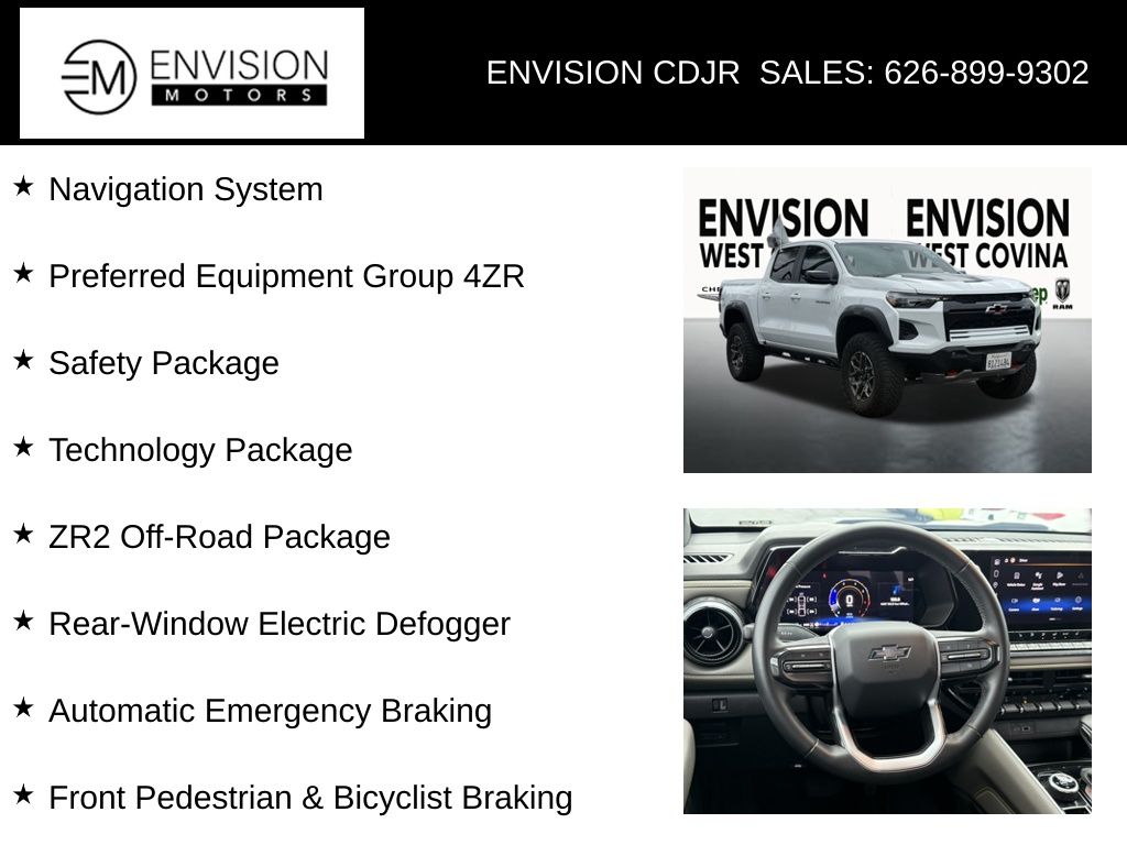 WE SPECIALIZE IN ALL CREDIT PROFILES! See what we can do for you! Call to find out (626) 899-9302.CARFAX One-Owner. Clean CARFAX.4WD, Adaptive Cruise Control, Automatic Emergency Braking, Blind Zone Steering Assist w/Trailering, Chevy Safety Assist, Electronic Automatic Cruise Control, Following Distance Indicator, Forward Collision Alert, Front Pedestrian & Bicyclist Braking, HD Surround Vision, IntelliBeam Automatic High Beam On/Off, Lane Keep Assist w/Lane Departure Warning, Navigation System, Preferred Equipment Group 4ZR, Rear Cross Traffic Braking, Rear Park Assist, Rear Pedestrian Alert, Rear-Window Electric Defogger, Safety Package, Technology Package, Wheels: 17" x 8" Graphite & Oxide Gold Aluminum, ZR2 Off-Road Package.Summit White2024 Chevrolet Colorado ZR2 4WD 8-Speed Automatic 2.7L I4 Turbocharged DOHC 16V LEV3-ULEV50 310hp**********All Pricing and Advertised Prices for any/all vehicles offered for sale does not include dealer installed accessories which can be purchased for an additional cost.********** The Factory Rebates may not be available on this vehicle if you elect to take advantage of a Special Alternative APR or Special Lease program. Some Factory Rebates are California Resident specific and may vary for residents of other states. NO sales to Dealers, Brokers or Exporters. For out of state purchase, customers must be present to purchase. If shipping is required, dealership must facilitate; no exceptions. Please contact us for special Multi-Vehicle or Fleet pricing. Prices are plus government fees and taxes, any finance charges, $85 documentary fee, $29 electronic registration fee, any emission testing charge and $1.75 per new tire state tire fee. *** We make every effort to provide accurate information, but please verify before purchasing. Leasing & financing available on approved credit. Trade-ins accepted. Subject to prior sale.Awards: * Motor Trend Truck of the Year