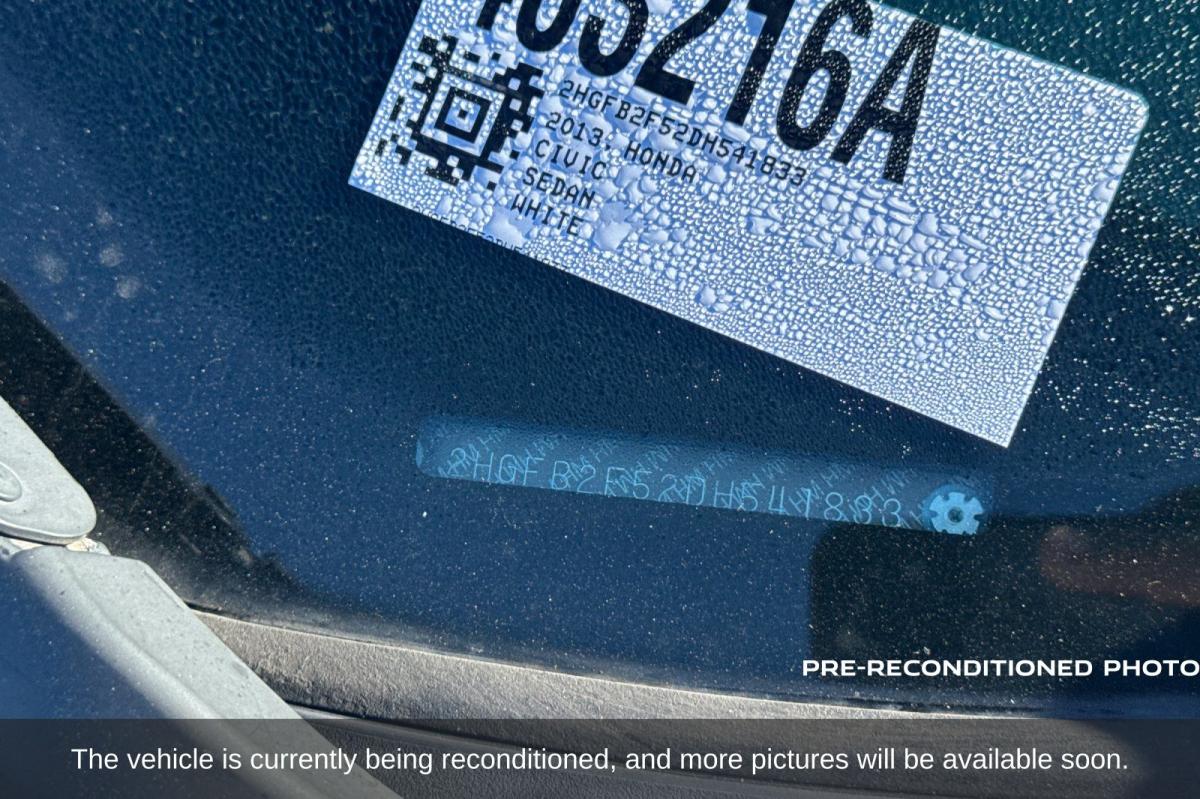 White 2013 Honda Civic LX FWD Compact 5-Speed Automatic 1.8L I4 SOHC 16V i-VTEC Beige Cloth, 160-Watt AM/FM/CD Audio System, ABS brakes, CD player, Exterior Parking Camera Rear.28/39 City/Highway MPGAwards: * JD Power Initial Quality Study * 2013 IIHS Top Safety Pick * 2013 KBB.com Brand Image AwardsKelley Blue Book Brand Image Awards are based on the Brand Watch(tm) study from Kelley Blue Book Market Intelligence. Award calculated among non-luxury shoppers. For more information, visit www.kbb.com. Kelley Blue Book is a registered trademark of Kelley Blue Book Co., Inc.Reviews: * * Winner of* *KBB Best Resale Value: Compact Car * Excellent fuel economy * Relatively spacious for a compact sedan or coupe * Reassuringly high scores in crash tests * Well-tuned suspension offering comfort with control Source: KBB.com