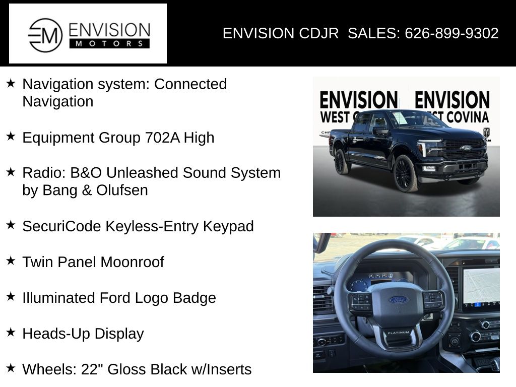 WE SPECIALIZE IN ALL CREDIT PROFILES! See what we can do for you! Call to find out (626) 899-9302.CARFAX One-Owner. Clean CARFAX.Odometer is 4643 miles below market average! 3.5L PowerBoost Full-Hybrid V6, 4WD, Equipment Group 702A High, Heads-Up Display, Illuminated Ford Logo Badge, Navigation system: Connected Navigation, Radio: B&O Unleashed Sound System by Bang & Olufsen, SecuriCode Keyless-Entry Keypad, Twin Panel Moonroof, Wheels: 22" Gloss Black w/Inserts.Black Metallic2025 Ford F-150 Platinum 4WD 10-Speed Automatic 3.5L PowerBoost Full-Hybrid V6**********All Pricing and Advertised Prices for any/all vehicles offered for sale does not include dealer installed accessories which can be purchased for an additional cost.********** The Factory Rebates may not be available on this vehicle if you elect to take advantage of a Special Alternative APR or Special Lease program. Some Factory Rebates are California Resident specific and may vary for residents of other states. NO sales to Dealers, Brokers or Exporters. For out of state purchase, customers must be present to purchase. If shipping is required, dealership must facilitate; no exceptions. Please contact us for special Multi-Vehicle or Fleet pricing. Prices are plus government fees and taxes, any finance charges, $85 documentary fee, $29 electronic registration fee, any emission testing charge and $1.75 per new tire state tire fee. *** We make every effort to provide accurate information, but please verify before purchasing. Leasing & financing available on approved credit. Trade-ins accepted. Subject to prior sale.